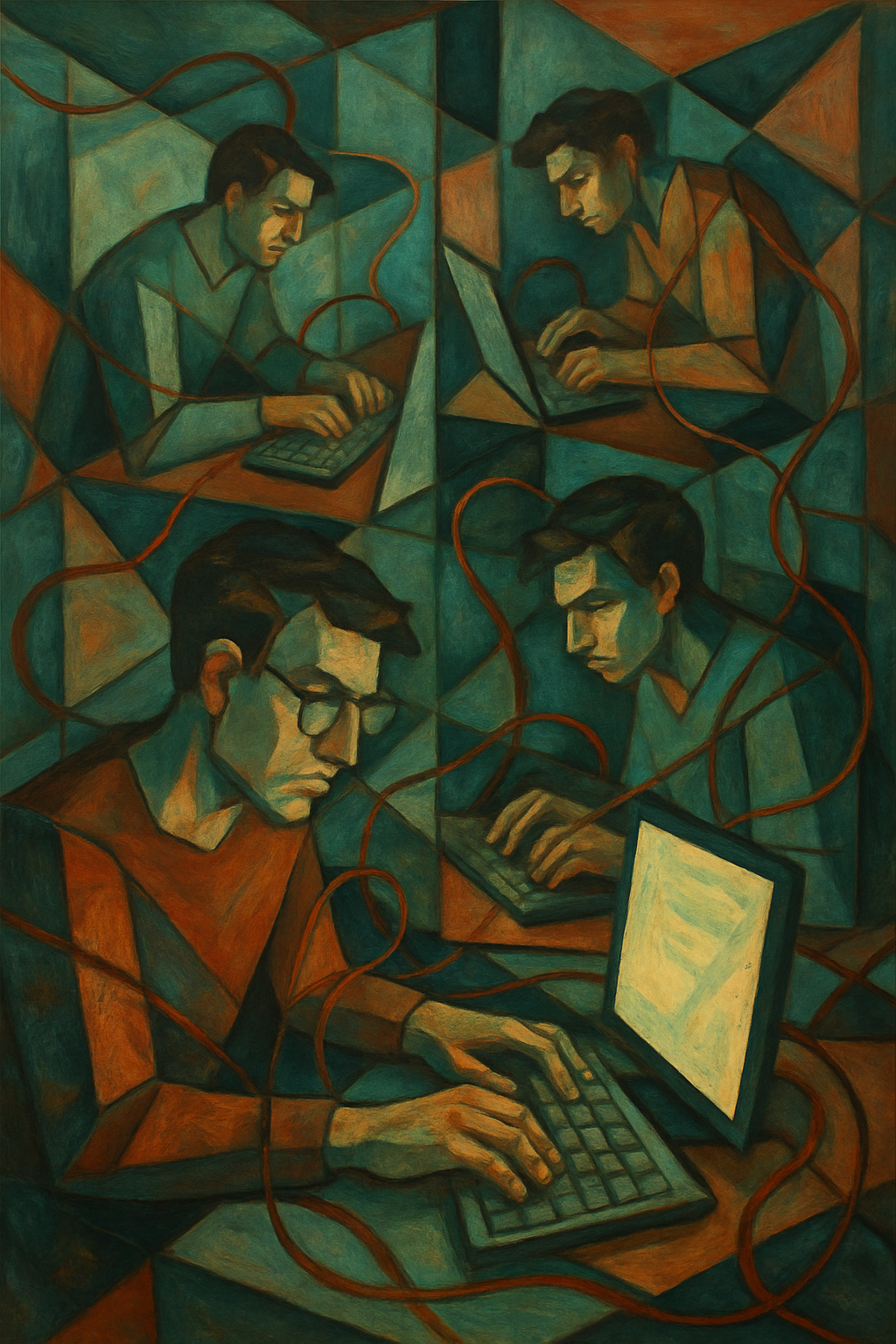 Art Prompt: An expressive Cubist interior showing a team of programmers scattered in fragmented geometric panels, each typing furiously in their own angular space. Muted aquas and rust reds dominate, with stylized cables weaving between figures like tendrils of digital connection. One glowing screen illuminates them all, symbolizing shared code and remote collaboration through abstraction.