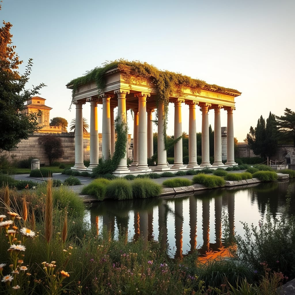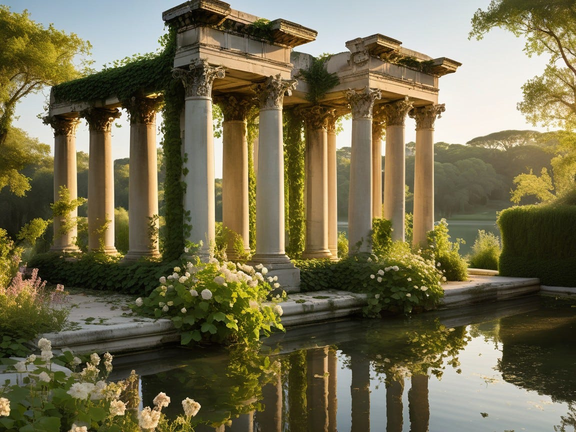 Art Prompt (Neoclassicism): A serene classical landscape at golden hour, featuring balanced architectural ruins overgrown with ivy and wildflowers, soft diffused light casting long gentle shadows across marble columns and still water reflecting a clear sky, harmonious composition with restrained elegance, muted earth tones blended with subtle luminous highlights, evoking timeless tranquility and ordered beauty.