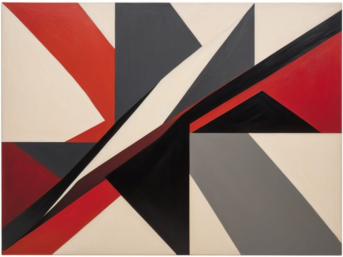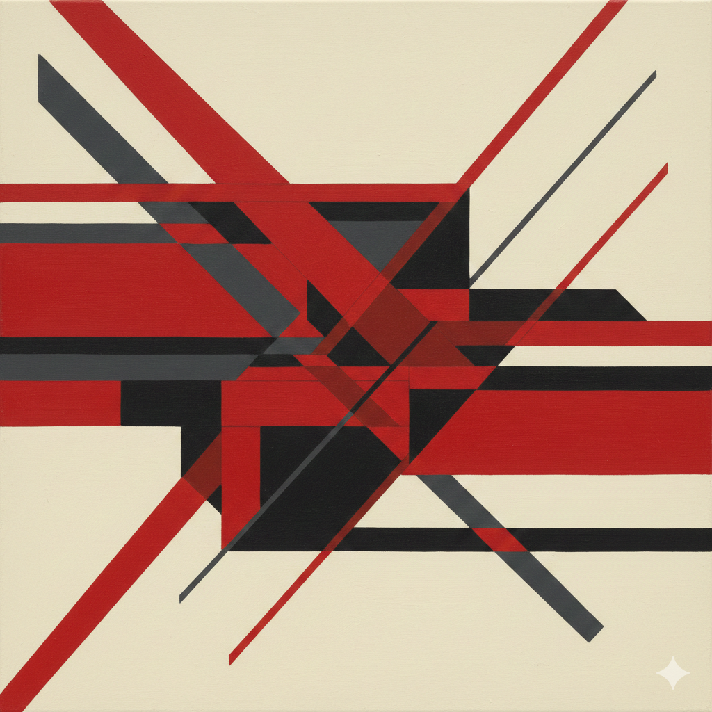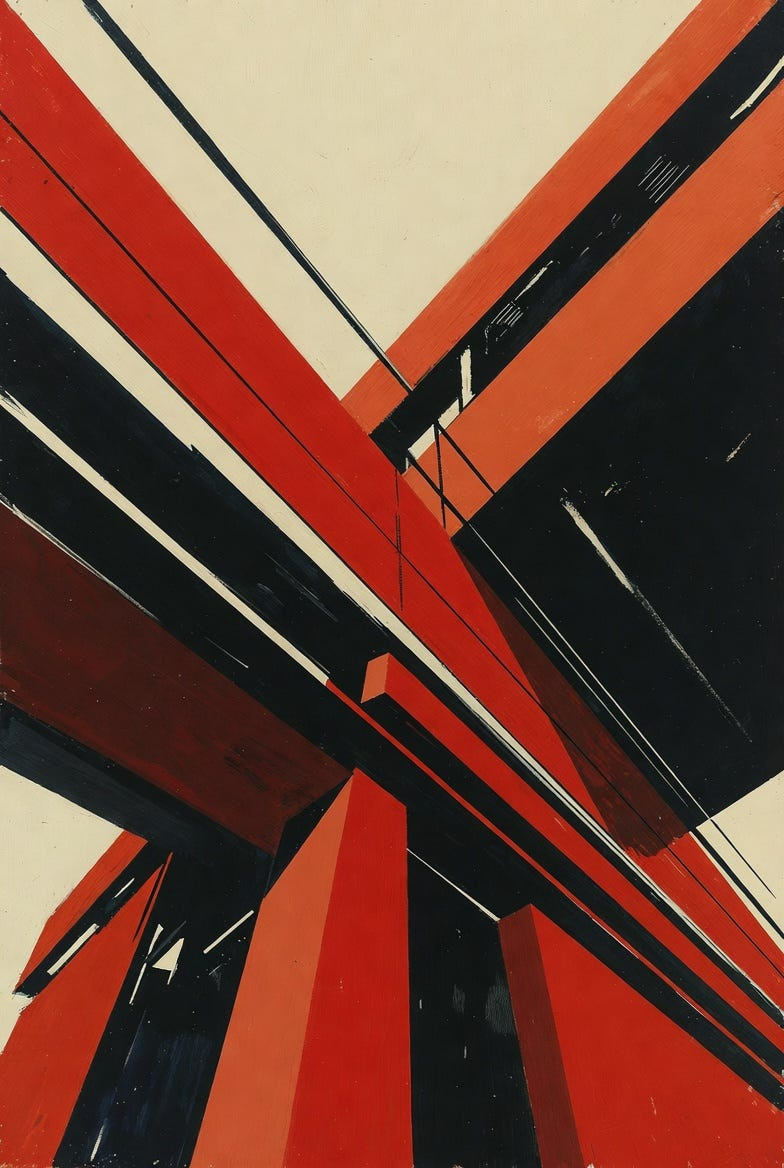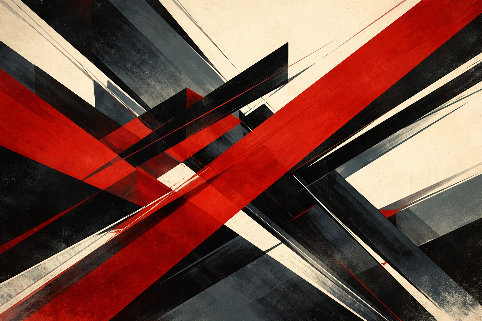 A bold geometric composition dominated by intersecting red and black angular forms against a muted cream background, sharp diagonal lines cutting across the canvas with rhythmic precision, dynamic asymmetry conveying industrial energy and forward motion, flat planes of color layered with subtle texture, strong contrast between saturated crimson, charcoal gray, and pale ivory, architectural shapes overlapping like machinery in motion, dramatic perspective shifts suggesting engineered space, clean graphic edges combined with slight hand-painted imperfections, an atmosphere of mechanical optimism and disciplined modernity.