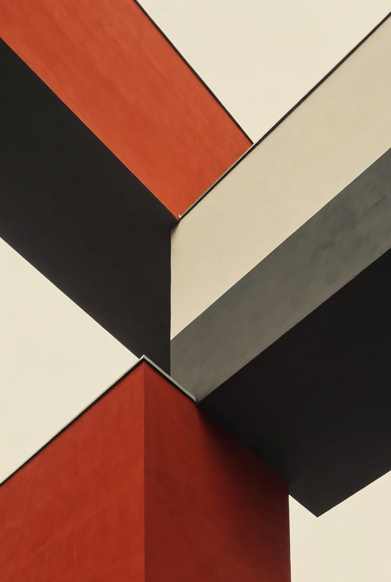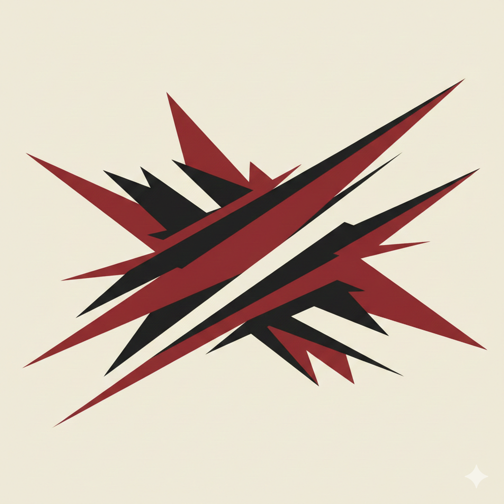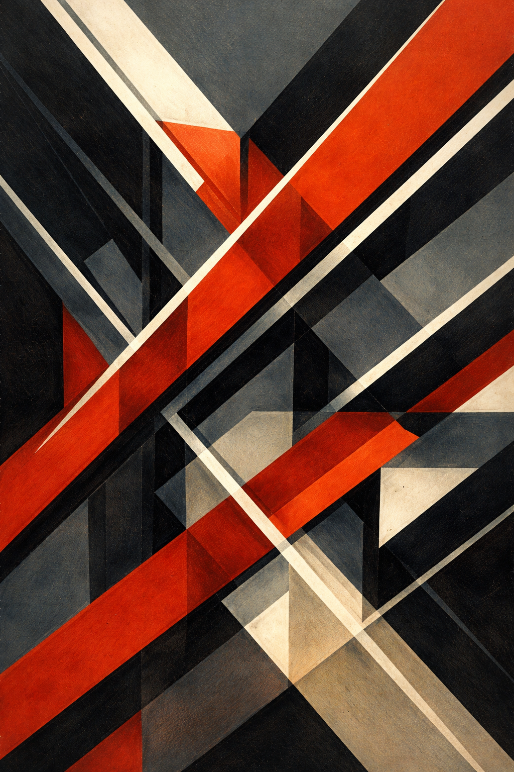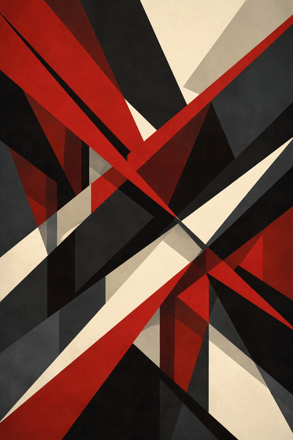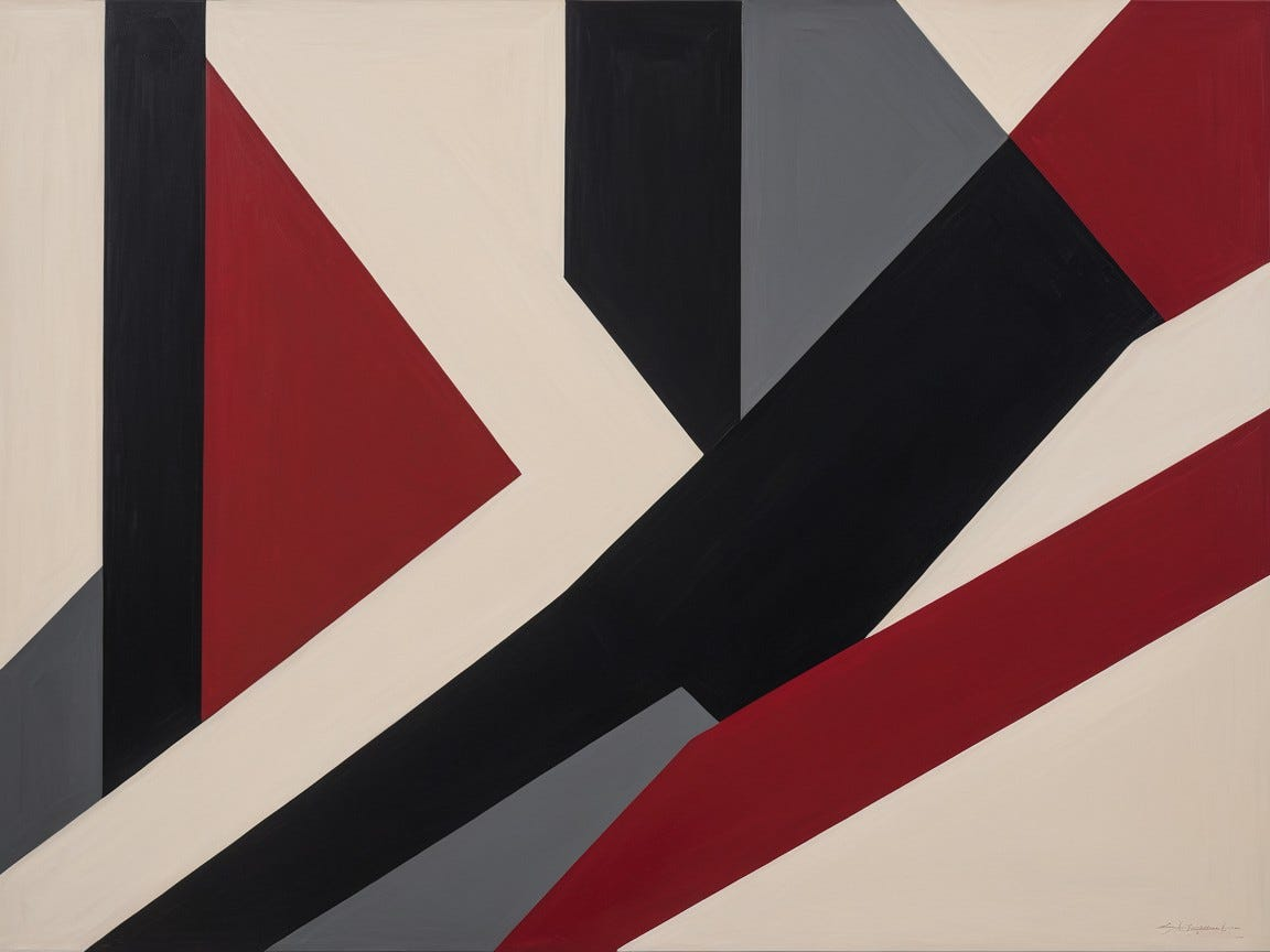 Art Prompt (Constructivism): A bold, geometric composition built from sharp angles and overlapping planes, dominated by strong diagonals that suggest motion and direction. A limited palette of deep reds, charcoal blacks, and muted creams creates visual tension, while flat blocks of color collide and interlock. The composition feels architectural and purposeful, with an industrial rhythm that conveys momentum and precision rather than emotion.