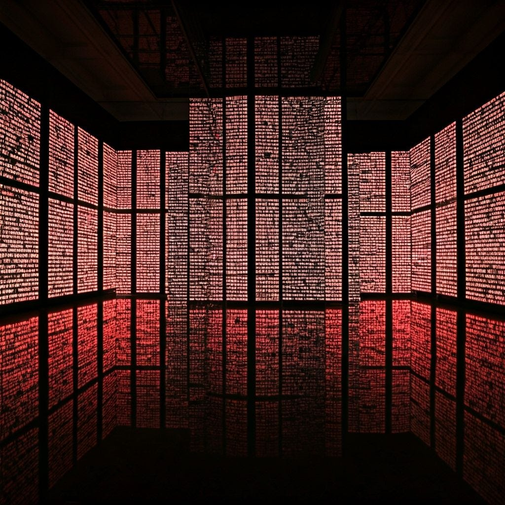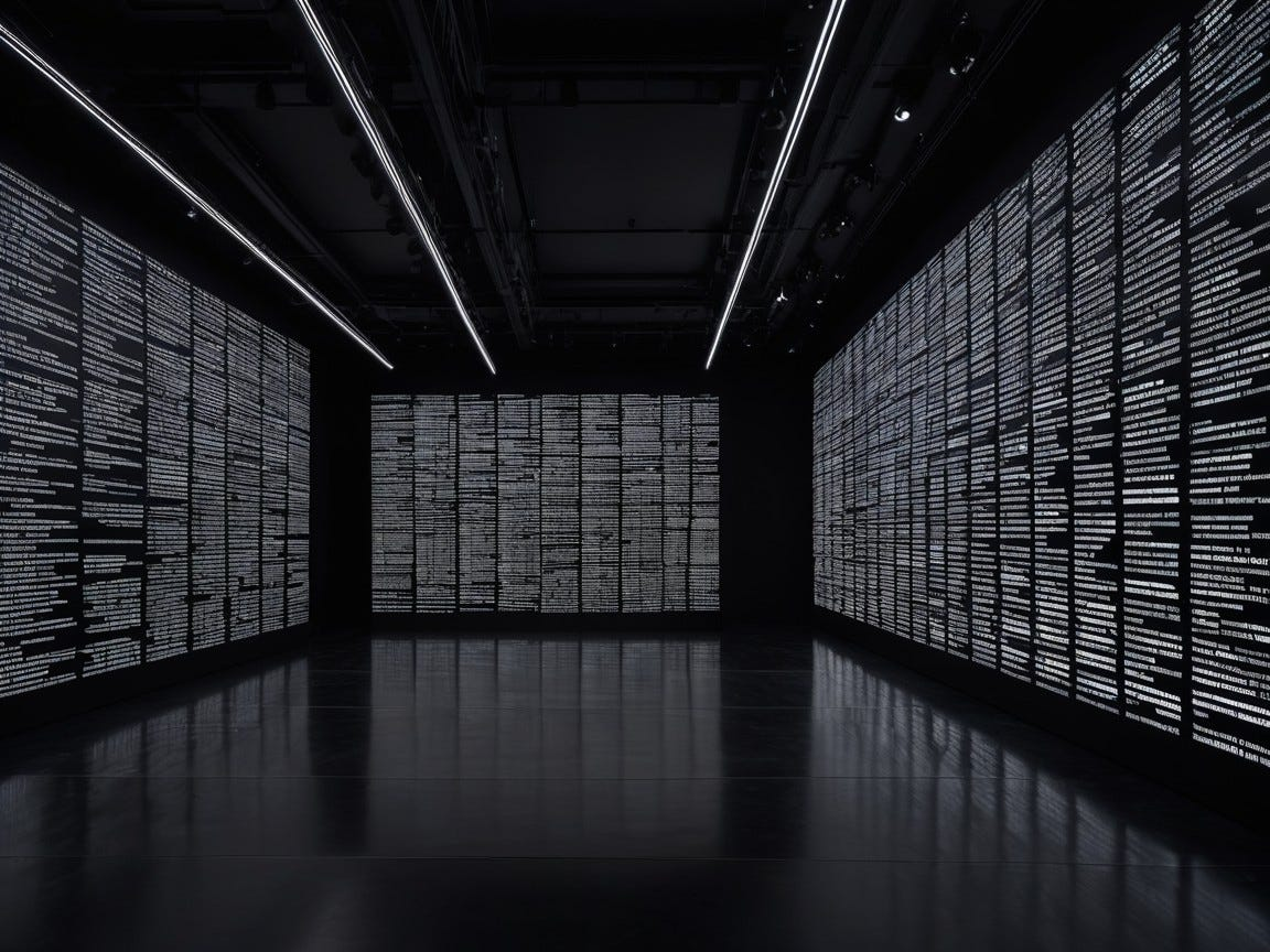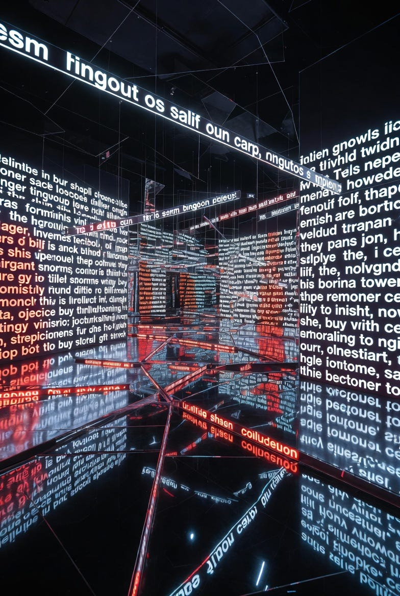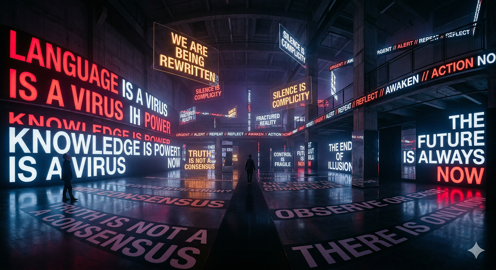 Art Prompt (conceptual): A monumental text-based installation unfolding across a cavernous dark gallery, where huge luminous phrases blaze across walls, floors, mirrored panels, suspended acrylic slabs, and scrolling LED bands in relentless layers of language. The composition should feel both austere and overwhelming, with sharp declarative statements colliding in space, reflected infinitely in polished black surfaces and fractured glass. Use a palette of electric crimson, icy white, amber LED glow, deep charcoal, and faint ultraviolet haze. Let the typography be immaculate, bold, and commanding, alternating between monumental stillness and hypnotic repetition. The mood should feel urgent, cerebral, seductive, and slightly unnerving, as if the room itself has learned how to think in slogans and now refuses to stop.