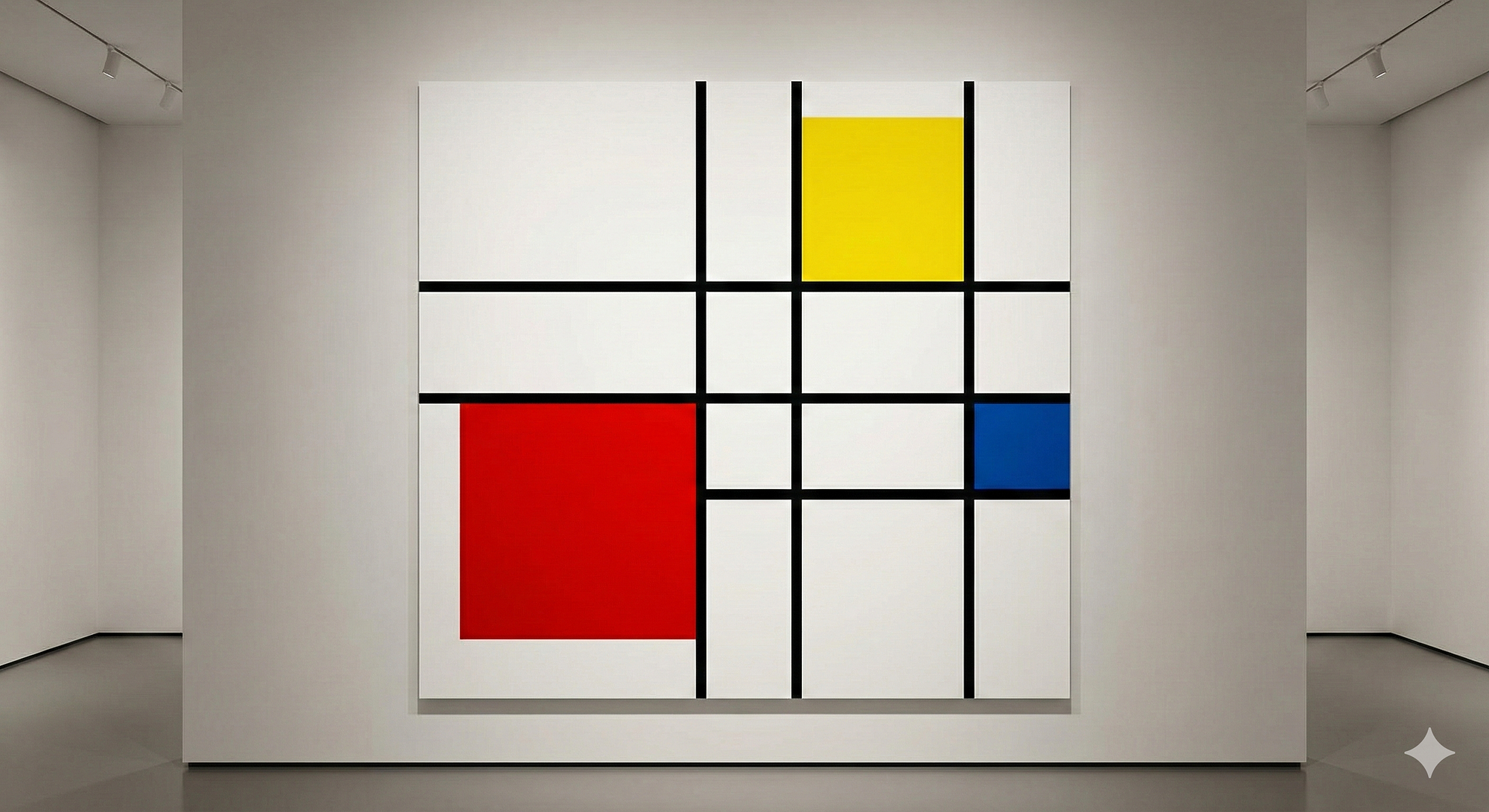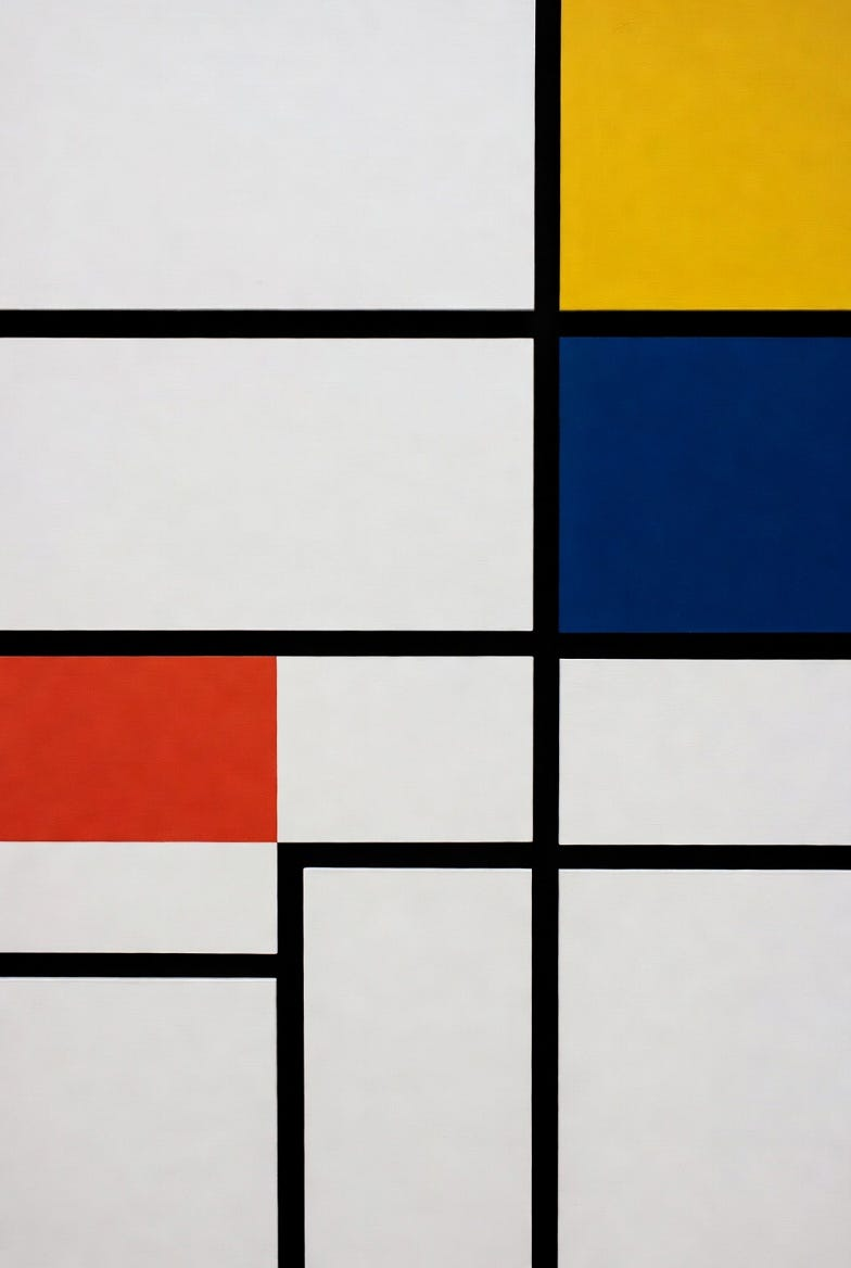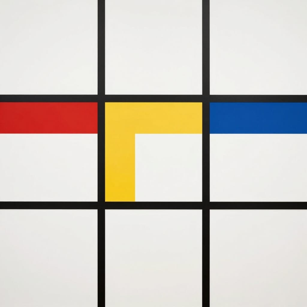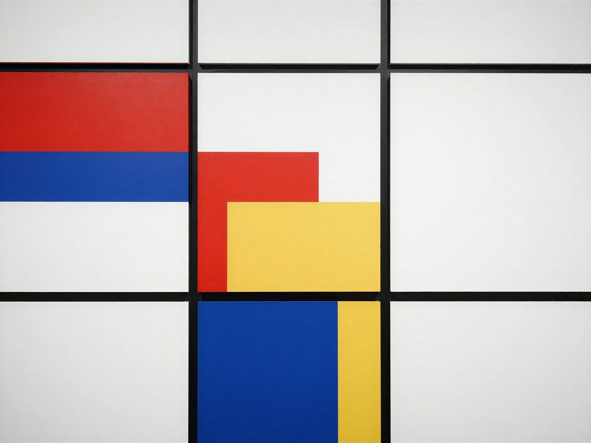 A crisp, geometric abstract composition built from a clean white field structured by thick black horizontal and vertical lines, forming an asymmetrical grid of rectangles and squares. A few select blocks are filled with flat, saturated primary colors — a vivid red rectangle that anchors the visual weight, a bright yellow panel that adds lift, and a deep blue block that cools the balance. The rest remains white, creating spacious negative areas that feel intentional and calm. The edges are razor-sharp, the paint appears smooth and matte, and the overall mood is quietly confident, orderly, and modern. High resolution, museum-quality lighting, perfectly flat planes, no texture, no gradients, minimalist precision.