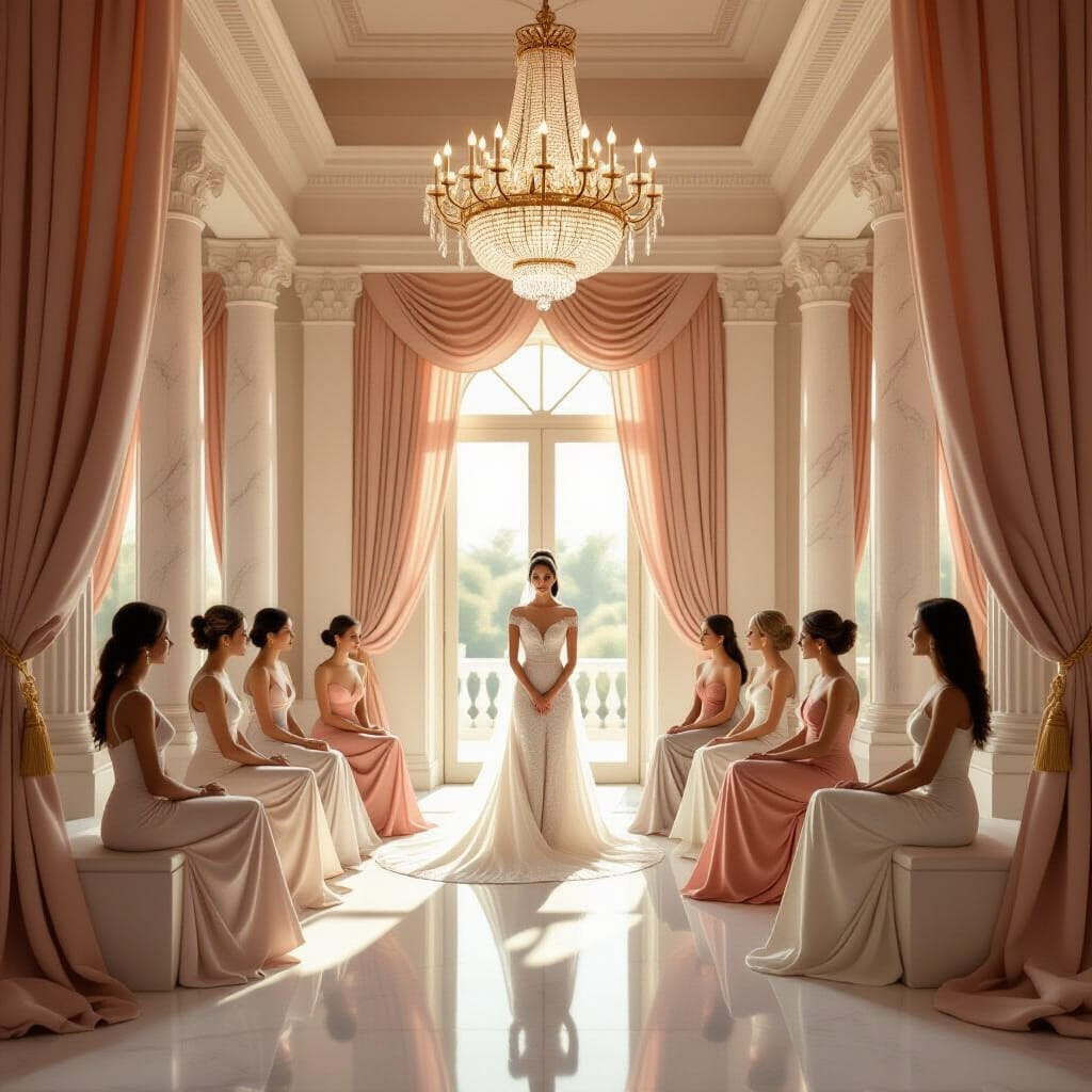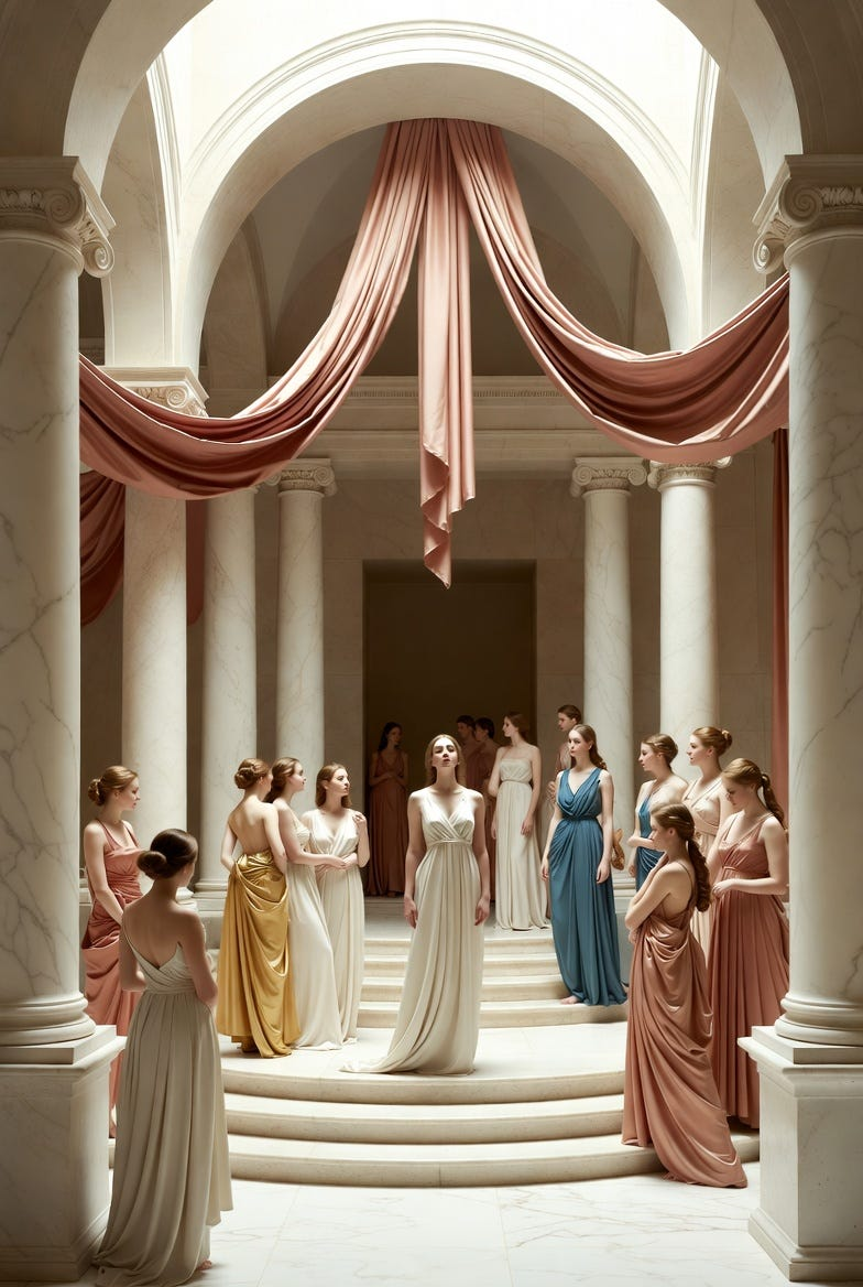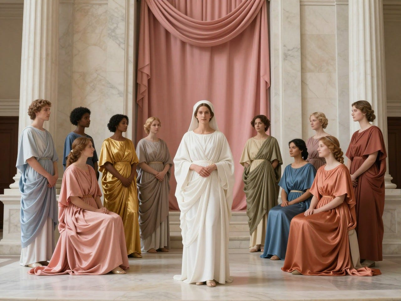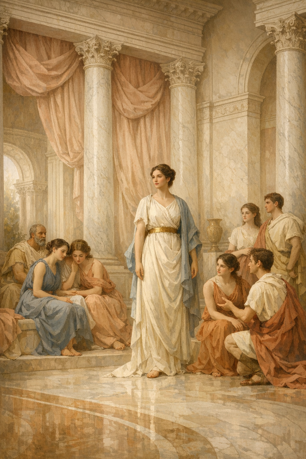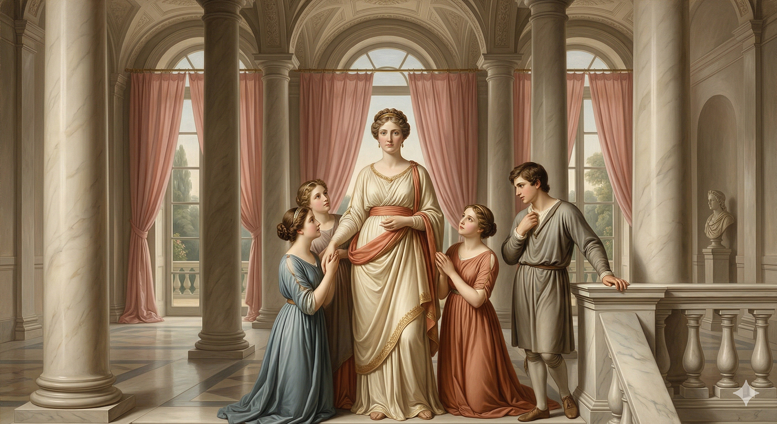 Art Prompt (Neoclassicism): A grand, luminous interior arranged with calm architectural dignity, where pale marble columns, soft rose drapery, and warm ivory stone frame a stately gathering of elegantly posed figures. The composition should feel balanced and ceremonial, with one serene central woman standing in quiet authority while younger figures cluster near her in graceful triangular rhythms. Use a refined palette of creamy whites, muted coral, antique gold, dusty blue, and soft terracotta, with satin-smooth skin tones and fabric that falls in sculptural folds. Let the lighting be clear, noble, and evenly diffused, emphasizing polished surfaces, moral gravity, and poised restraint rather than spectacle. The mood should feel elevated, harmonious, and emotionally sincere, as if virtue itself has been staged with impeccable taste and classical confidence.
