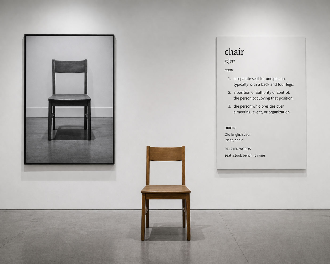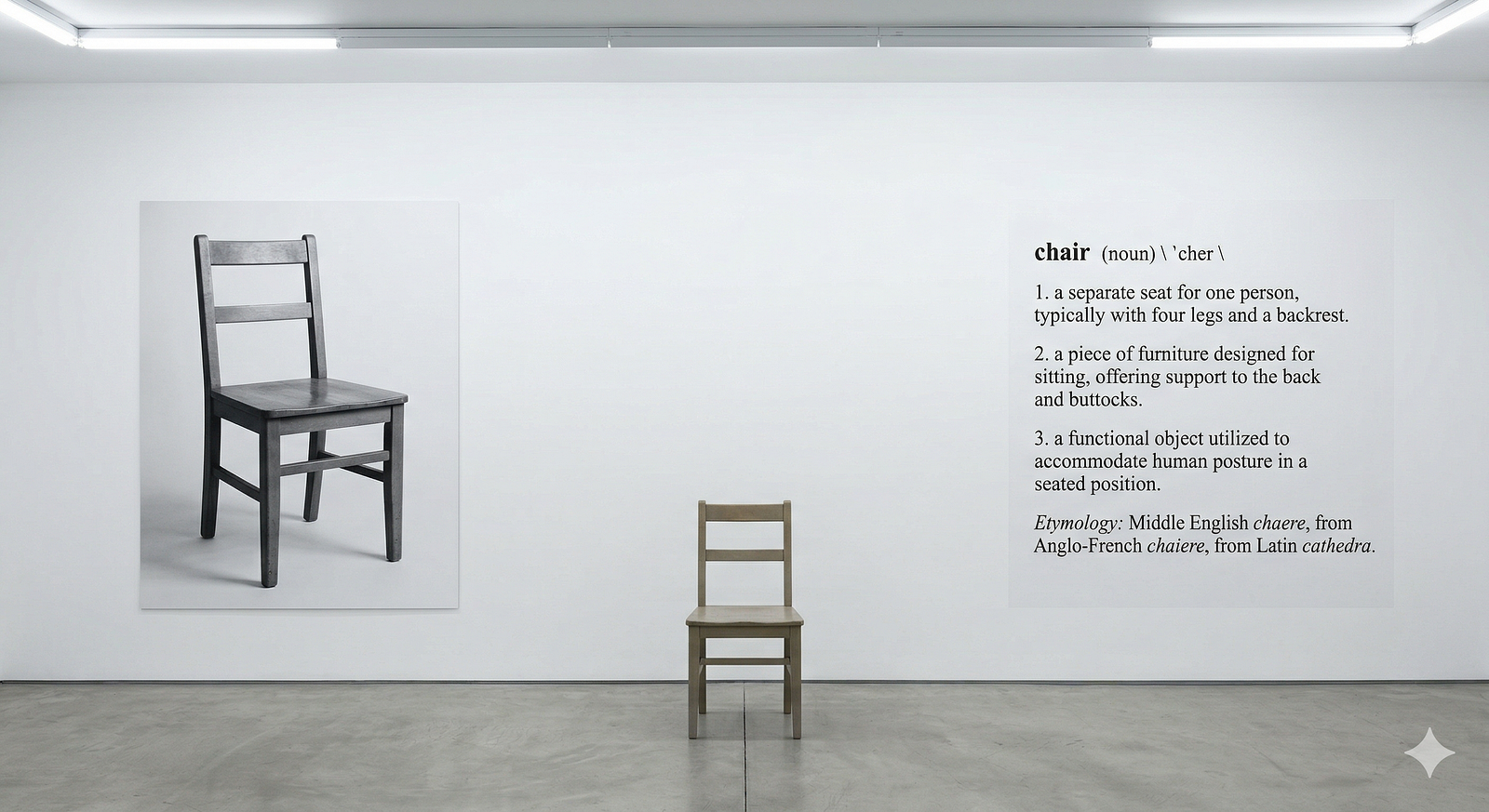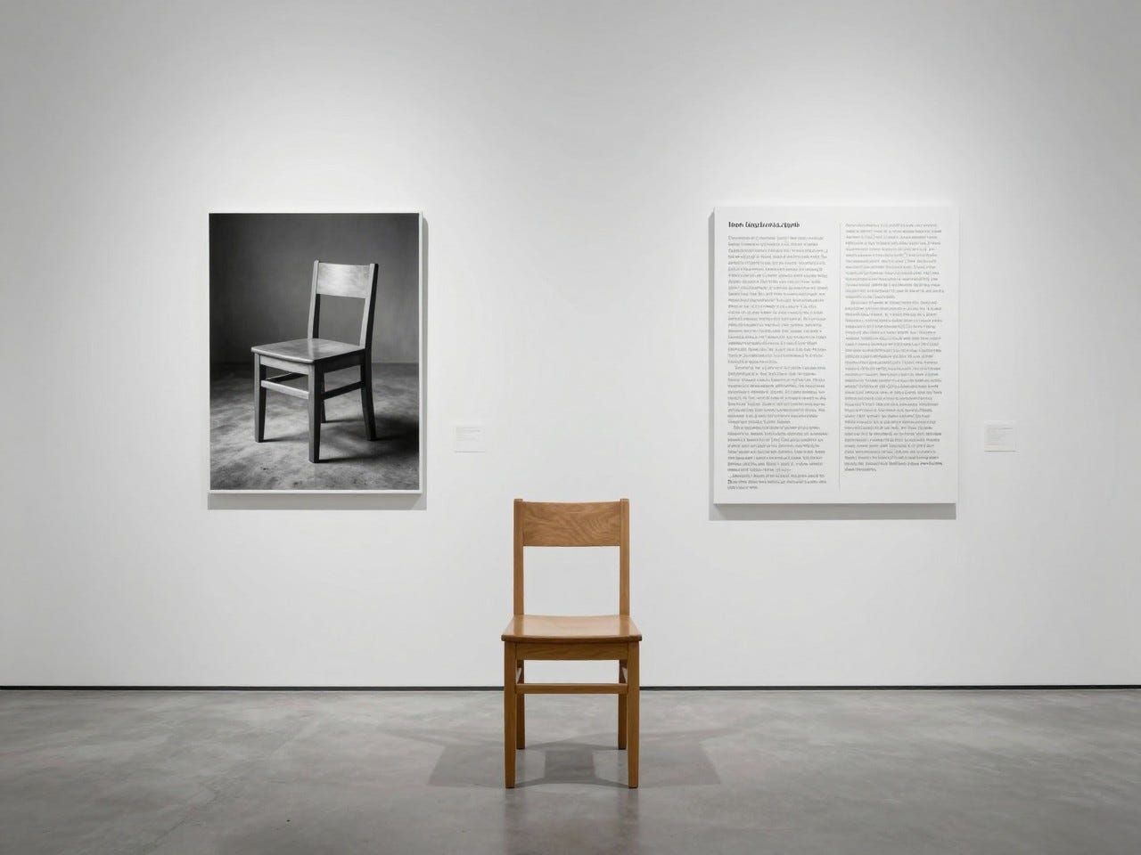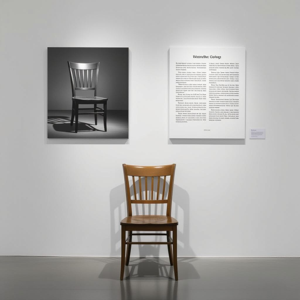 Art Prompt (Conceptual Art): A severe white gallery wall with a plain wooden chair placed slightly off-center beneath cold institutional light. Beside it, hang a crisp black-and-white life-size photograph of the same chair, and on the other side mount a large panel of dictionary-style text defining the object in clinical language. Keep the composition stark, frontal, and intellectually dry, with generous negative space, exact spacing, pale gray shadows, matte surfaces, and the strange tension of an ordinary object turned into an argument. The mood should feel cool, cerebral, mischievous, and quietly destabilizing, as if the room is inviting the viewer to debate reality with furniture.