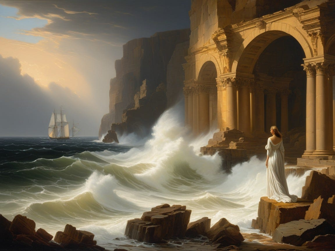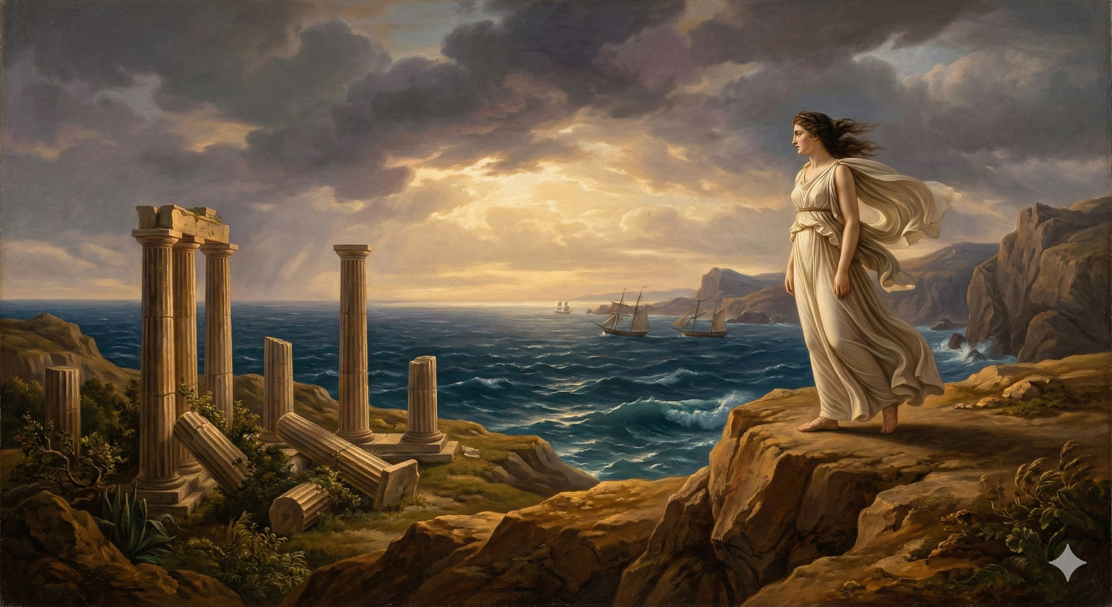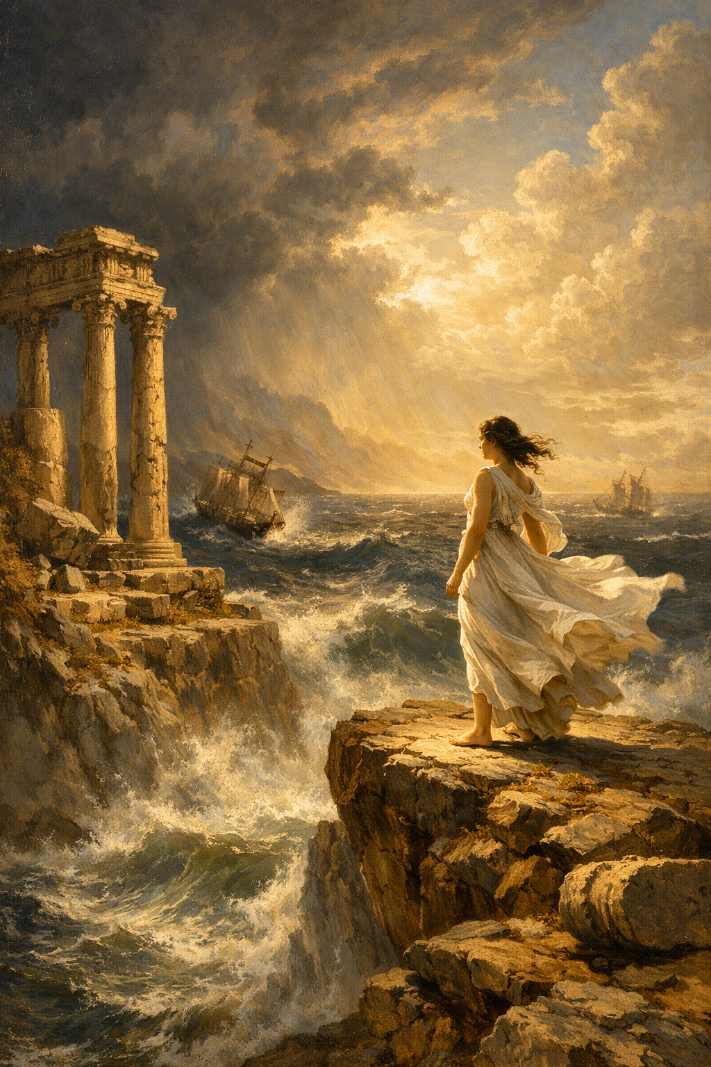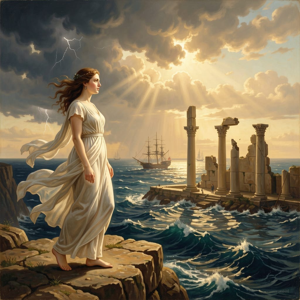 A dramatic seascape illuminated by storm-cleared golden light, featuring a lone female figure standing at the edge of a towering cliff, wind pulling at her flowing white garments, her posture resolute yet contemplative. The composition is balanced with architectural ruins in the midground, classical columns fractured but dignified, while distant ships struggle against churning waves. The palette leans toward warm ochres, deep ultramarine blues, and luminous alabaster skin tones, rendered with precise anatomical detail and crisp linear clarity. The atmosphere is charged with moral gravity and quiet heroism, echoing the grandeur and disciplined brushwork of late 18th-century European academic painting. Subtle chiaroscuro modeling defines the musculature and fabric folds, while the sky opens into radiant hope beyond the storm.
