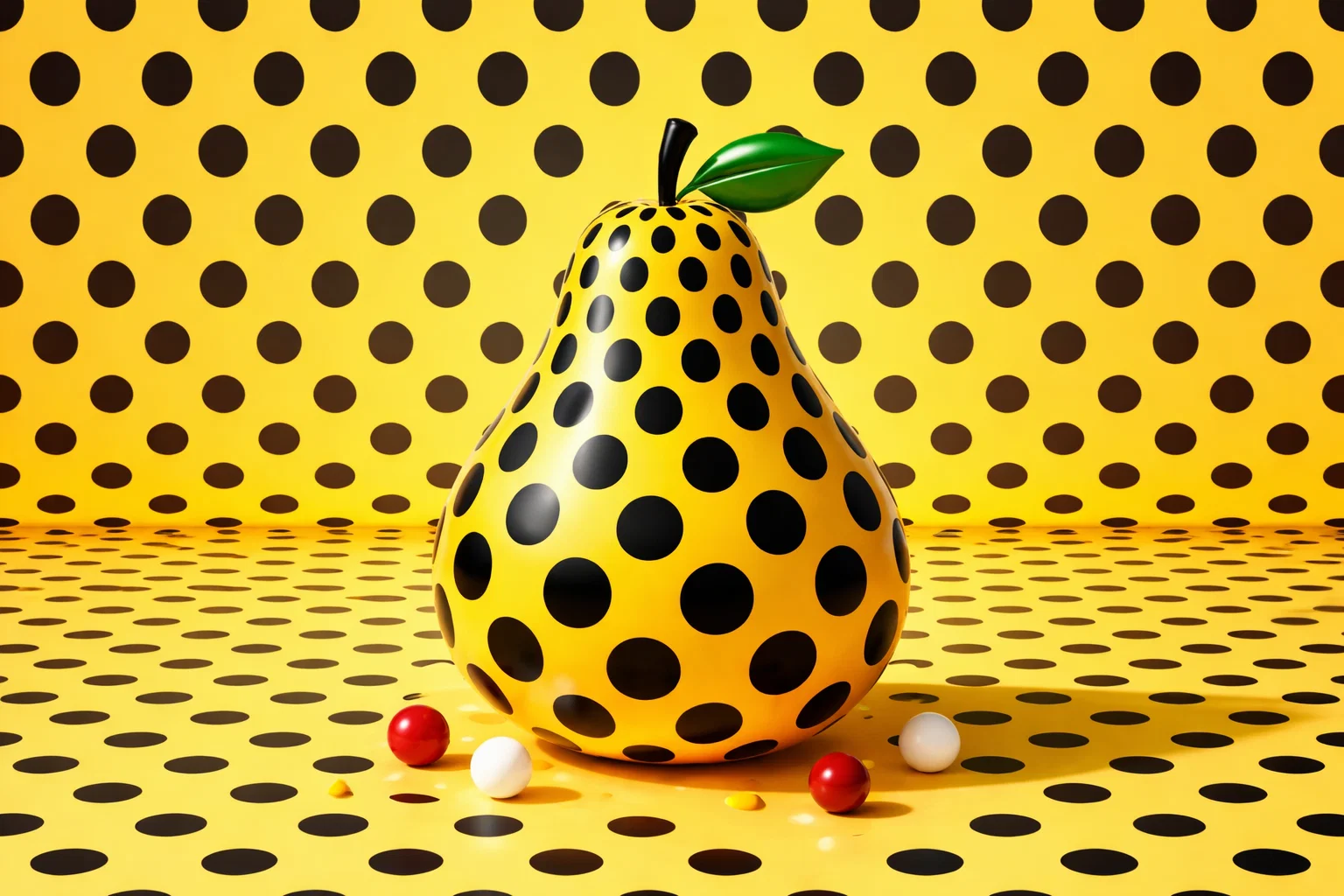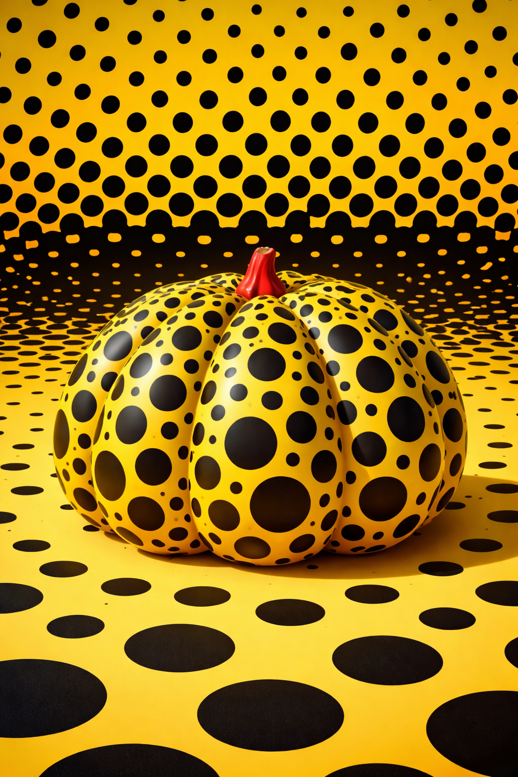 Art Prompt (Surreal Pop): A whimsical still-life scene centered on a single bold, organic form with a rounded silhouette, rendered in clean, confident contours and saturated color. The surface is covered in dense, perfectly spaced polka dots that subtly vary in scale, creating a vibrating optical rhythm. The background is a flattened, high-contrast field with graphic simplicity, punctuated by repeating dot patterns that fade toward the edges like an endless horizon. Lighting is bright and even, with soft shadows that keep the mood playful yet slightly uncanny. The palette features radiant yellows, deep blacks, crisp whites, and small accents of warm reds, with a glossy finish that feels sculptural. Composition is minimal but commanding, with a sense of joyful obsession and controlled repetition.