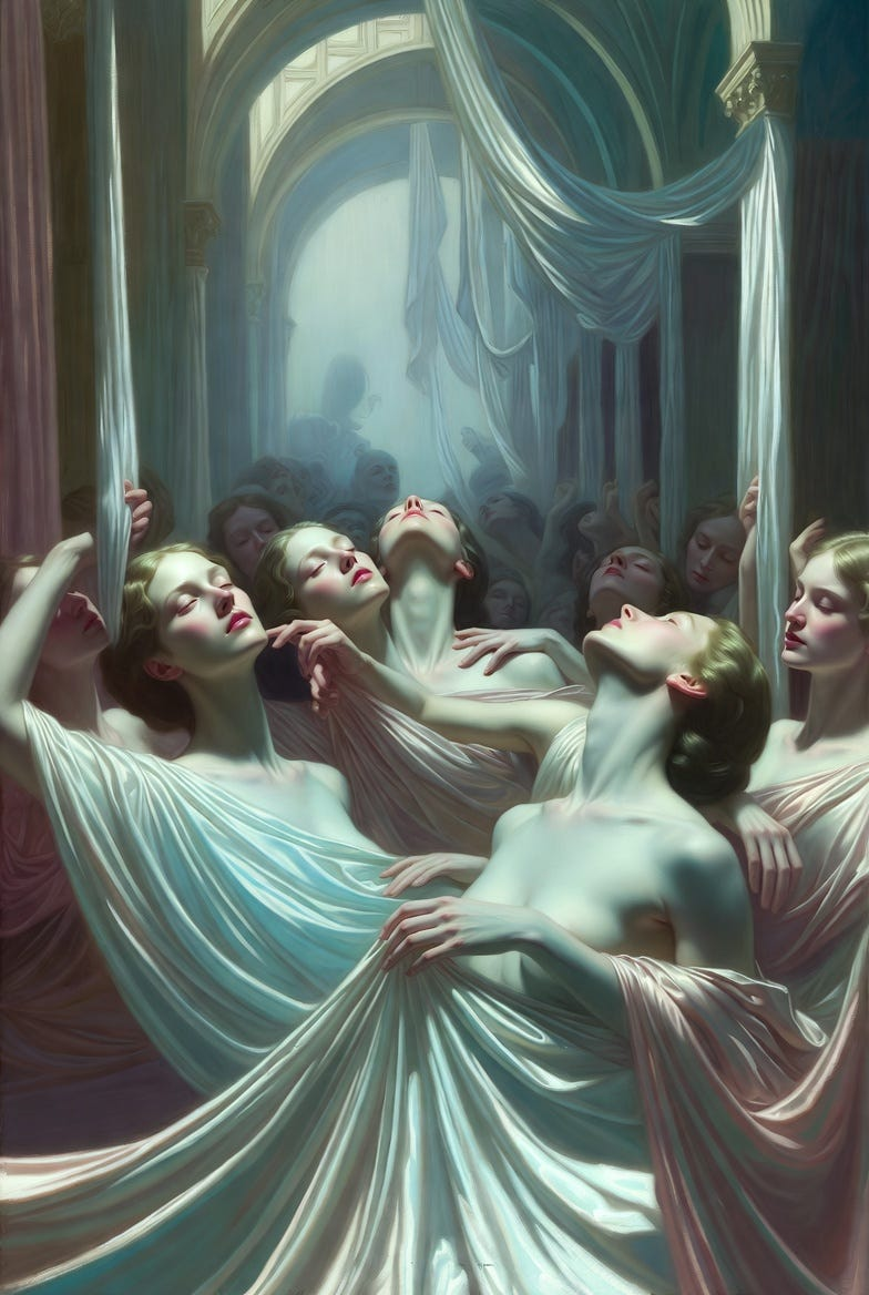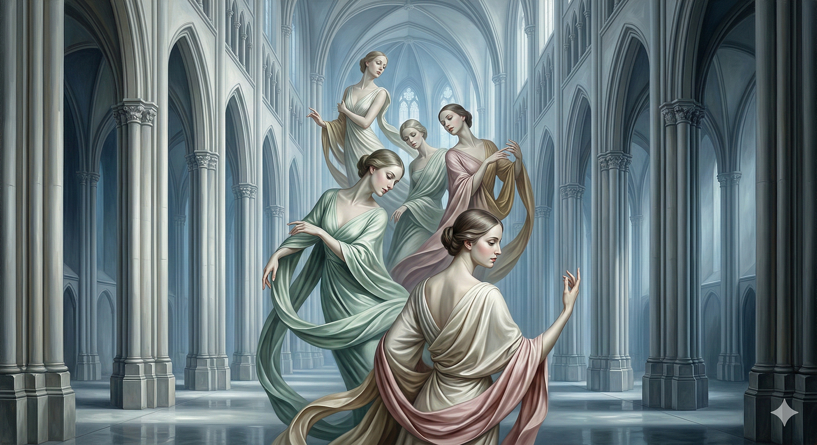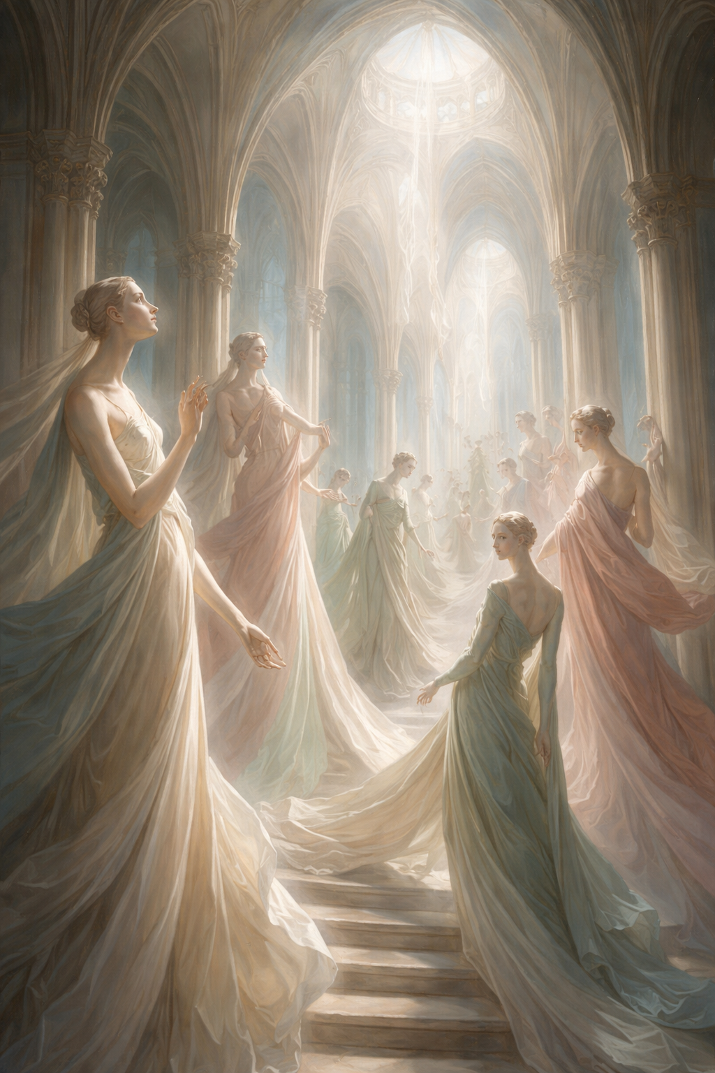 A tall, luminous interior with soaring arches and an unnervingly elegant stillness; elongated figures arranged in a graceful spiral composition, their necks and hands subtly extended beyond natural proportion, as if reality itself has been gently stretched. Drapery cascades in silky ribbons of pale ivory, cool celadon, and soft rose, catching a pearly, theatrical light that makes skin appear almost porcelain. Faces are serene yet charged with quiet intensity, eyes slightly too calm, gestures slightly too poised. The background recedes into refined architectural depth with delicate columns and shadowed alcoves, while a cool, atmospheric haze adds dreamlike tension. Brushwork is smooth and polished, edges crisp where fabric meets light, with a sophisticated, high-contrast glow that feels sacred and slightly uncanny. No table-centered gathering; keep the scene vertical, airy, and subtly surreal through proportion and pose.