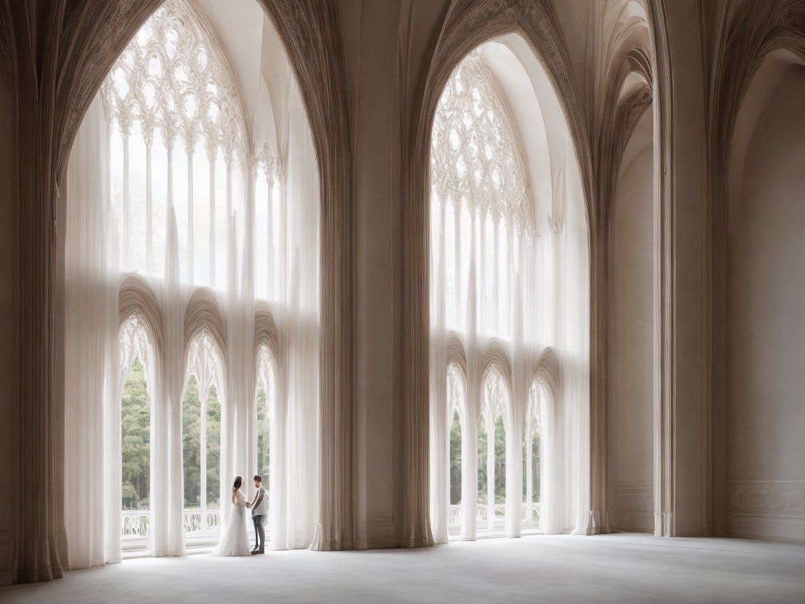 Open on a slow upward glide from the hem of flowing ivory fabric to an elongated hand suspended in mid-gesture, then continue the camera rise into towering arches that feel impossibly tall. Use gentle speed ramps: slow, devotional motion punctuated by quick, elegant whip-pans to jeweled highlights on drapery folds. Add a soft parallax drift so the figures feel sculptural and slightly unreal, like they are floating a fraction away from the architecture. Let light “bloom” across celadon and rose fabrics in rhythmic pulses, as if the room is breathing. Introduce micro-movements: a near-imperceptible turn of a serene face, a subtle lift of a ribbon of cloth, a shimmer of pearly haze passing through the beams of light. End with a smooth pull-back revealing the full spiral arrangement of elongated figures, then a quick final snap-zoom into a calm eye that holds the frame for the last beat.