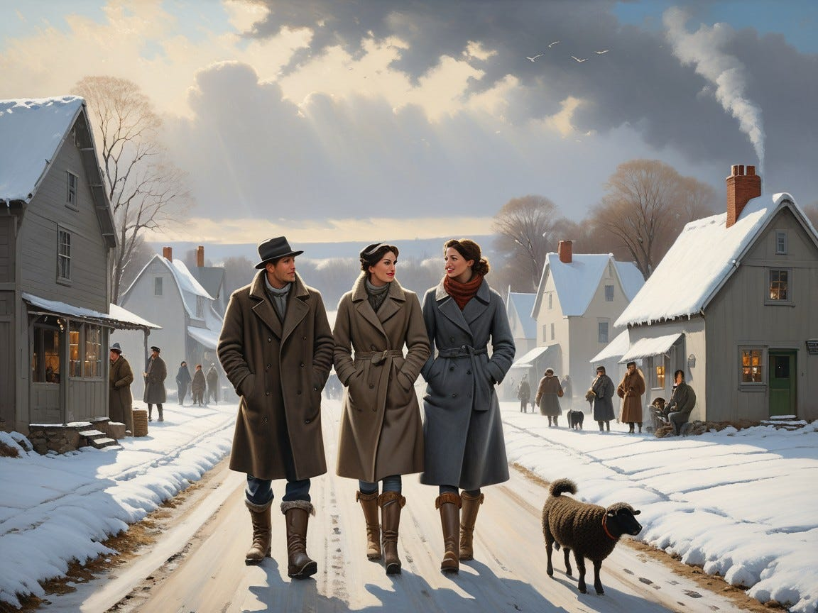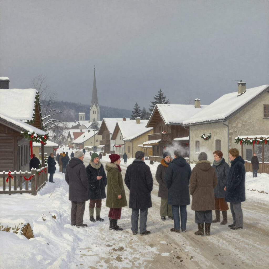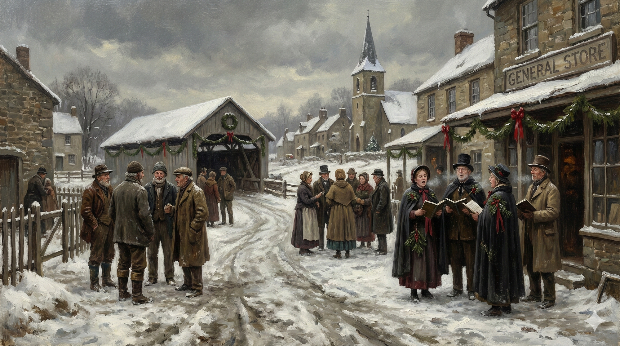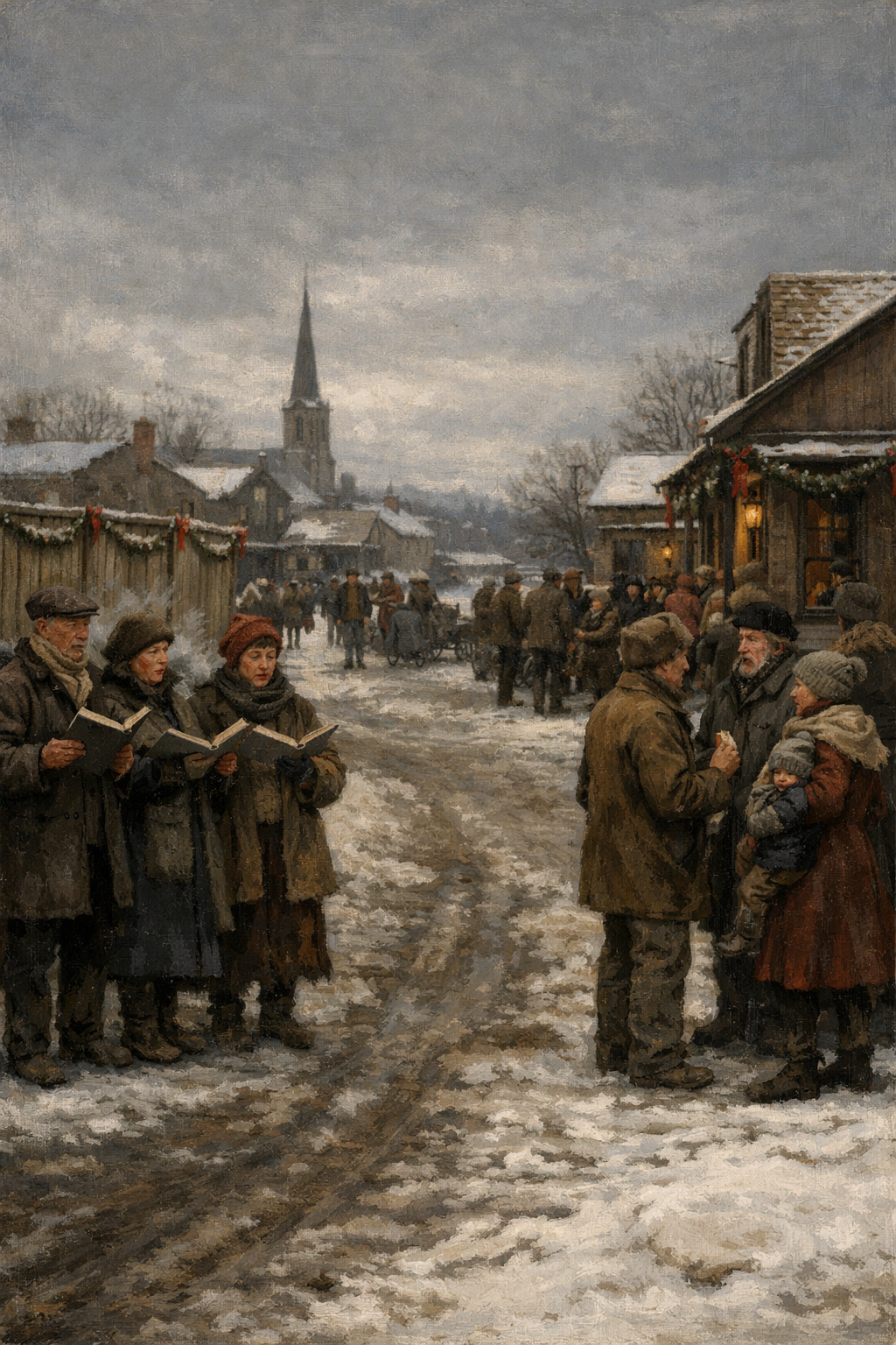Art Prompt (Realism): A large, candid winter village scene rendered with grounded realism and earthy restraint, like an unposed moment captured on a wide horizontal canvas. The sky is a cold pewter gray and the snow is packed and slightly dirty near the road edges, reflecting muted daylight. Townspeople in heavy wool coats and worn boots gather in small clusters, their faces individualized with subtle expressions and imperfect features, as if each person has a story. Holiday garlands and simple red ribbons hang sparingly from a wooden fence and a few storefronts, never glossy, always practical. A small group of carolers stands near the foreground, breath visible in the air, while a distant church spire and low stone buildings anchor the background. The palette is subdued: umbers, slate blues, charcoal, and soft off-whites, with restrained pops of deep cranberry and evergreen. Lighting is natural and overcast, with gentle tonal transitions and confident, textured brushwork that emphasizes fabric, snow, and weathered wood. The mood is quietly festive and human, more honest than sparkly, with a sense of communal warmth inside a cold day.