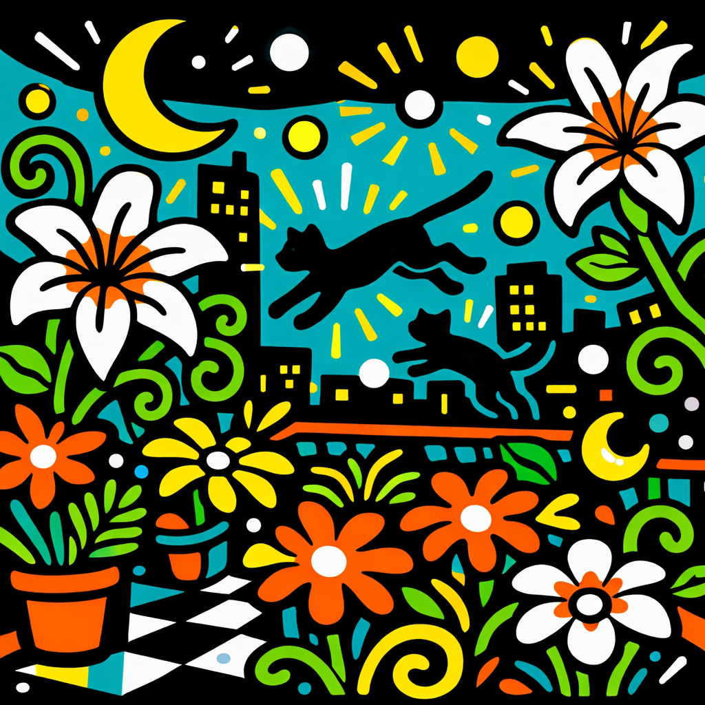 Art Prompt (Neo Pop): A moonlit rooftop garden transformed into a pulsing field of graphic life, filled with oversized lilies, curling vines, leaping cats, and tiny glowing moons, all rendered in thick, unbroken contour lines and flat, electric color. Shapes overlap in a lively visual rhythm, with figures and plants radiating motion through short energy marks and repeating halos. The palette should be bold and high-contrast: saturated turquoise, hot orange, lemon yellow, deep black, and bright white, with almost no shading. Keep the forms simplified, playful, and iconic, but pack the composition tightly so the whole scene feels like it is dancing in place. The mood is exuberant, urban, and slightly surreal, with crisp edges, symbolic clarity, and the visual punch of a mural made at top speed by someone who trusted every line.