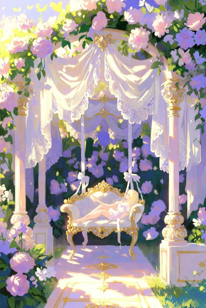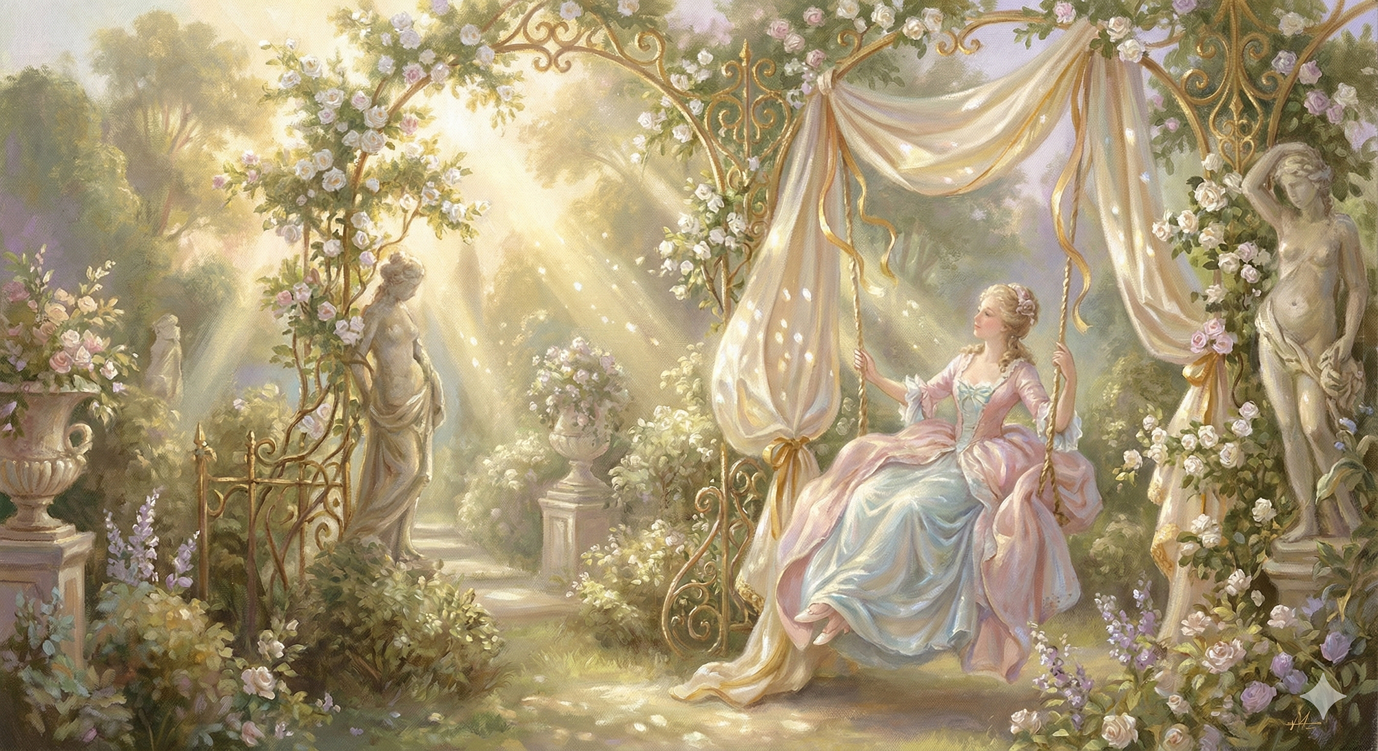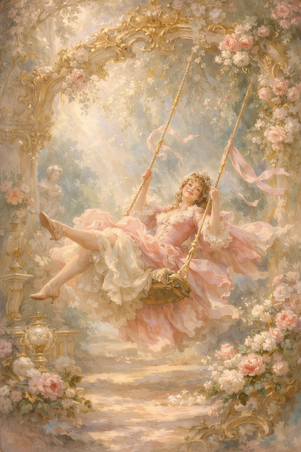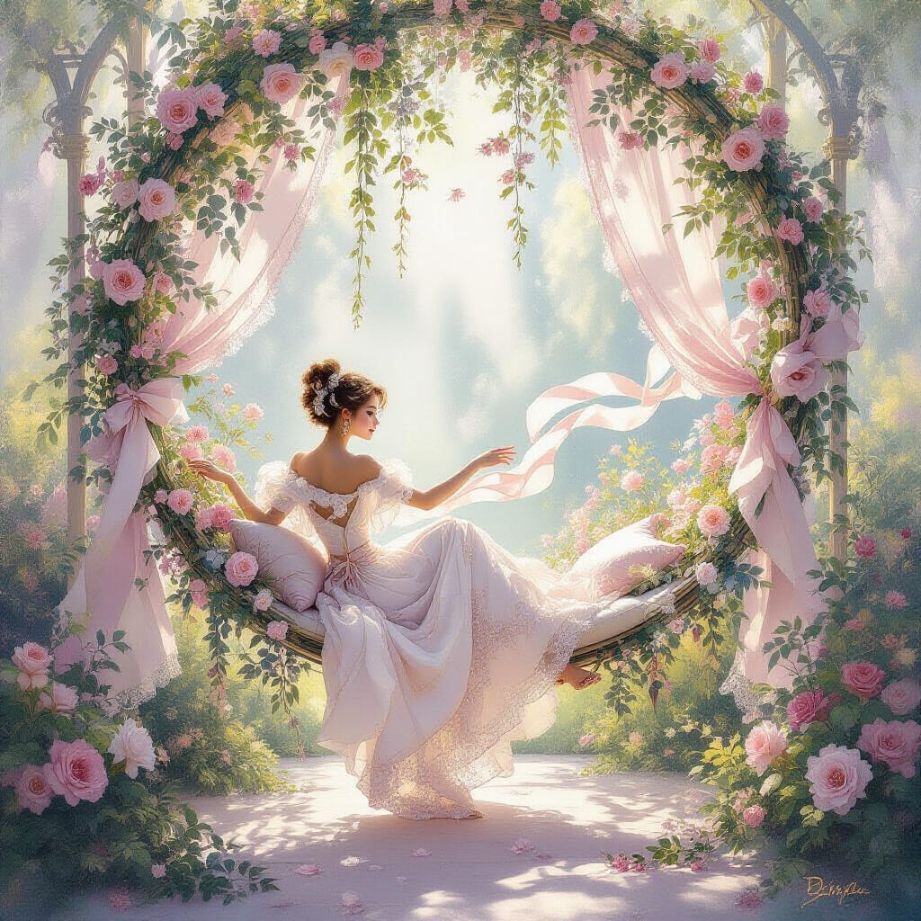 Art Prompt (Rococo): A luminous, ornate garden scene painted with delicate, airy brushwork and playful elegance. Sunlight filters through lace-like foliage, scattering warm pearl highlights across billowing pastel fabrics and gilded decorative details. The composition feels theatrical yet weightless: a graceful figure on a suspended seat arcs through a flowering arbor, ribbons fluttering and silk folds catching the light like spun sugar. The palette is soft and indulgent — powder pinks, creamy ivories, pale celadon greens, and hints of gold leaf — balanced by cool shadows in lavender and misty blue. The mood is flirtatious, dreamy, and slightly mischievous, with intricate textures and ornamentation that make the whole scene feel like a sweet secret told in a whisper.