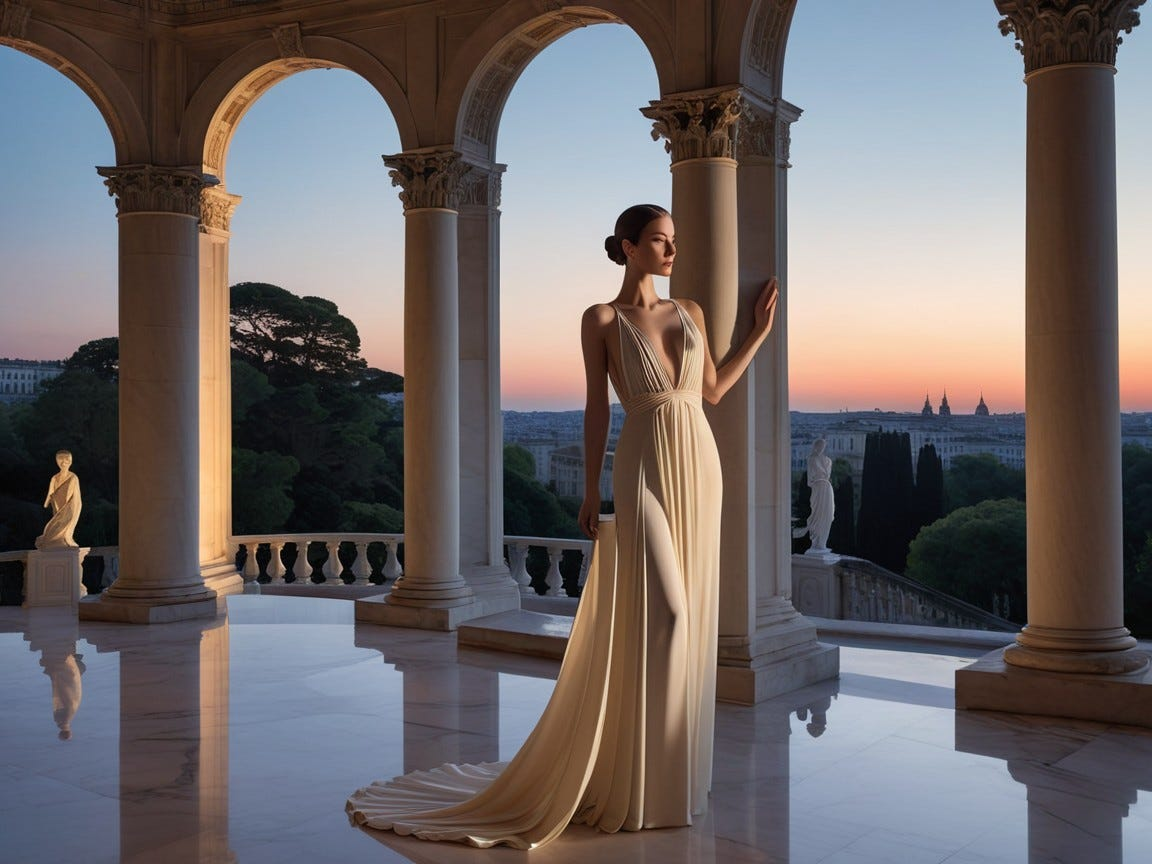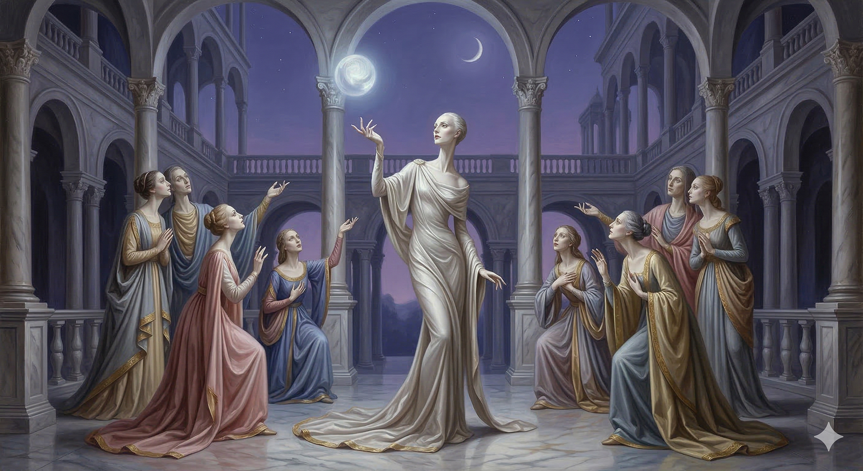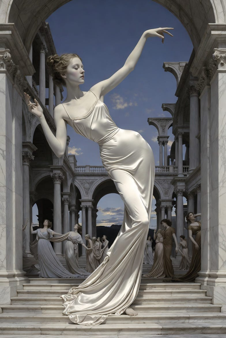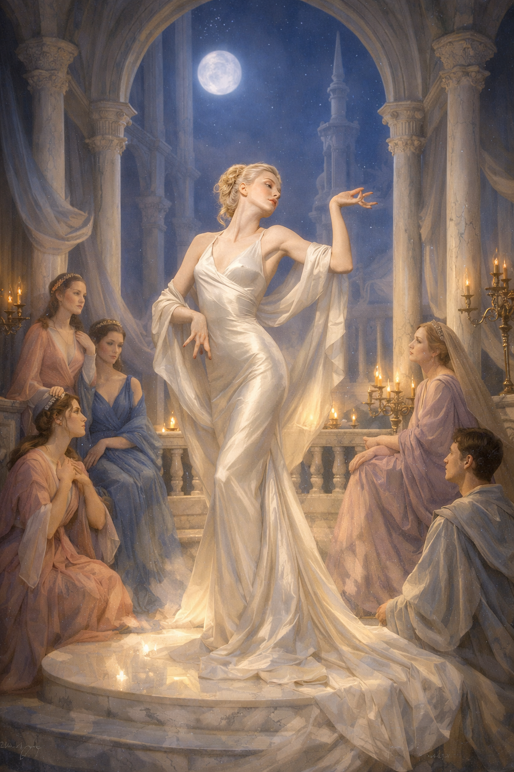 Art Prompt (Mannerism): An elegant, elongated figure in pale silk stands in a marble loggia at twilight, surrounded by impossible architecture that stretches a little too high and columns that feel subtly too slender to trust. The body twists in a graceful serpentine pose, hands delicate and theatrical, while attendants in flowing garments cluster in layered, stage-like arrangements around a luminous central form. Cool moonlit ivory, soft rose, muted ultramarine, and touches of antique gold dominate the palette. The composition should feel polished, courtly, and faintly uncanny, with refined drapery, porcelain skin, compressed depth, and a mood of poised beauty drifting just slightly beyond normal proportion.