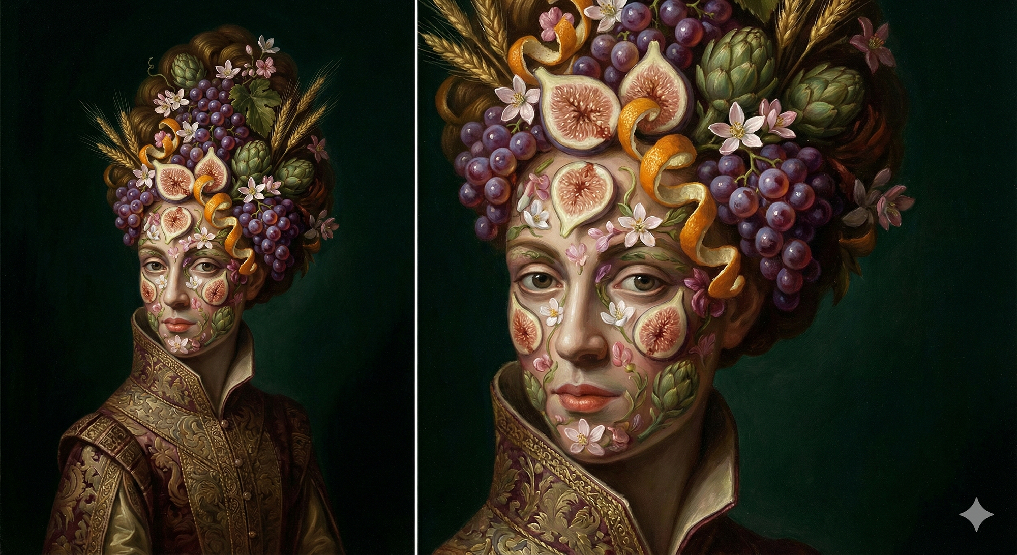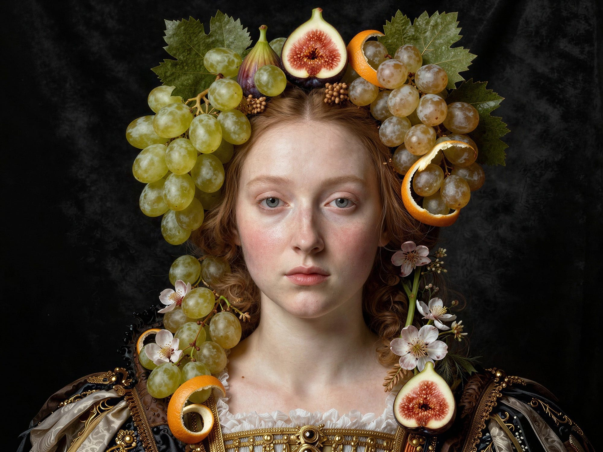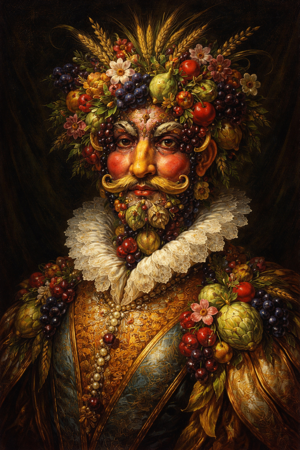 A highly stylized, courtly portrait with elegant, elongated proportions and refined, slightly unreal grace. The subject is a regal figure posed front-facing against a dark, velvety backdrop, but the face and hair are composed entirely of meticulously arranged fruits, flowers, leaves, and ripening grains. Each element is rendered with jewel-like precision: glossy grapes, pale figs with translucent flesh, curling citrus peel, delicate blossoms, and crisp vegetables woven into an ornate, symmetrical design. Dramatic, controlled lighting sculpts the forms with subtle highlights and deep shadows, emphasizing texture and botanical detail. The mood is playful but aristocratic, with an uncanny, museum-worthy finish, rich color saturation, and a polished, late-renaissance elegance.