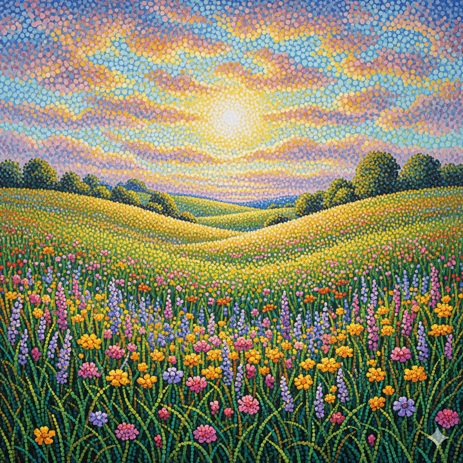 Art Prompt (Pointillism): A sun-dappled meadow bursting with thousands of tiny, vibrant dots in warm golds, soft pinks, cool lavenders, and emerald greens, creating a shimmering optical harmony where individual points blend into luminous fields of wildflowers and distant rolling hills under a vast, dappled sky, evoking serene tranquility and meticulous joyful energy through patient, meticulous stippling.