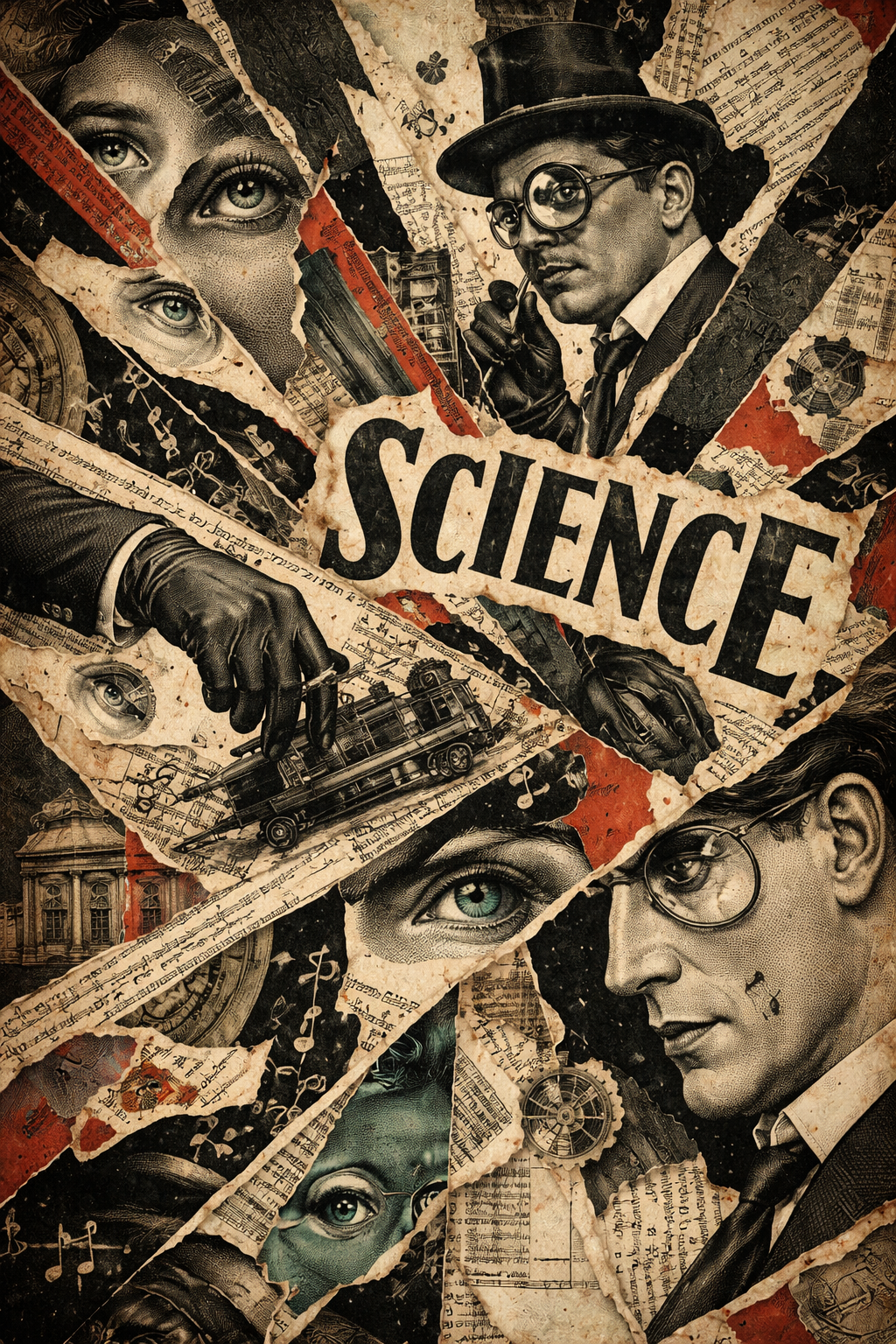 Video Prompt: Burst straight into motion with torn poster fragments snapping across the screen like cards thrown by an irritated magician. Mechanical diagrams rotate, ticket stubs flutter past the lens, cropped faces blink in and out through jump cuts, and sharp black letters slam into place only to scatter again. Use rhythmic collage animation with fast parallax, punchy zoom-ins, spinning paper layers, and sudden scale shifts so the composition feels alive, chaotic, and irresistibly clever. Keep the movement crisp, stylish, and beat-driven, with the final second locking all the fragments into a perfectly balanced photomontage before one rogue letter skitters loose.