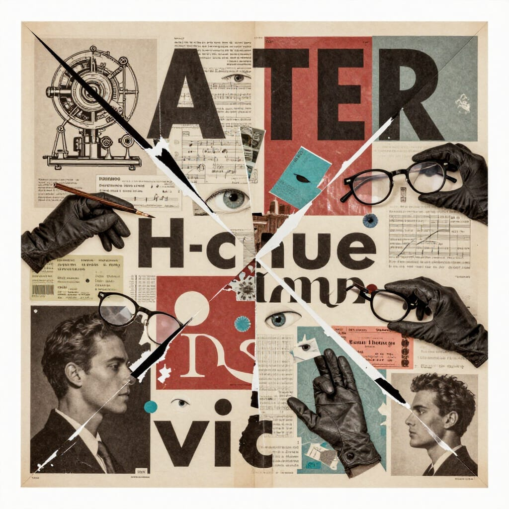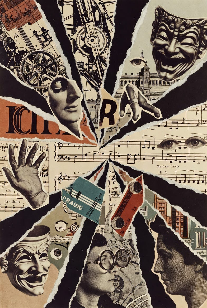 Art Prompt (Dadaism): A feverish photomontage assembled from torn theater posters, mechanical diagrams, gloved hands, monocles, train tickets, fragments of musical notation, and clipped human profiles arranged in a deliberately unruly but sharply balanced composition. Use a restrained palette of sepia, newsprint cream, charcoal black, muted vermilion, and small flashes of oxidized teal. Let jagged diagonals slash across the frame while oversized typography collides with miniature architectural fragments and floating eyes. The mood should feel witty, intellectual, anarchic, and stylishly confrontational, with crisp cut-paper edges, vintage print grain, overlapping textures, and the sense that the whole image is arguing with itself and winning.