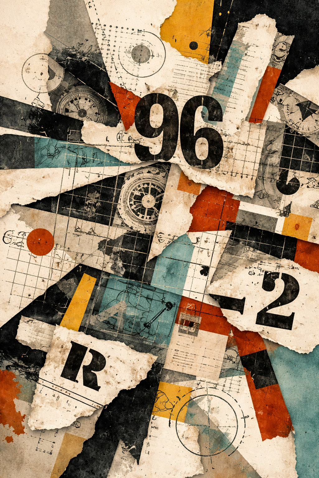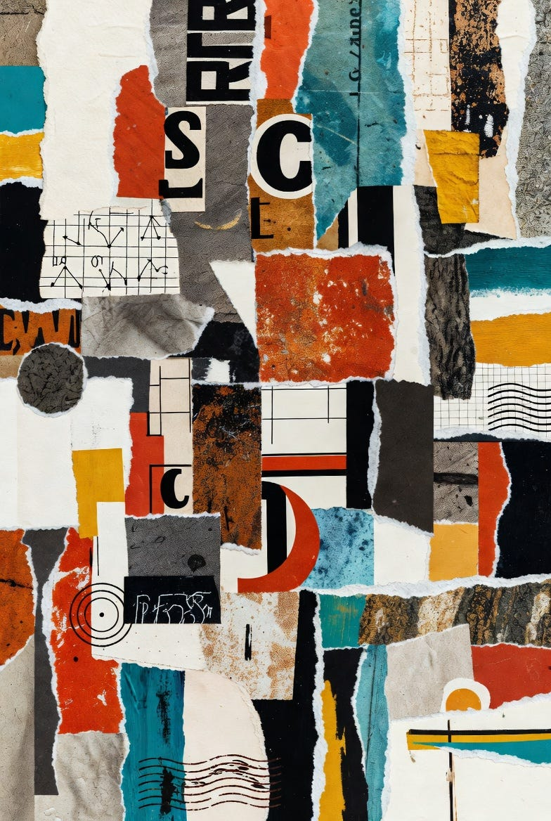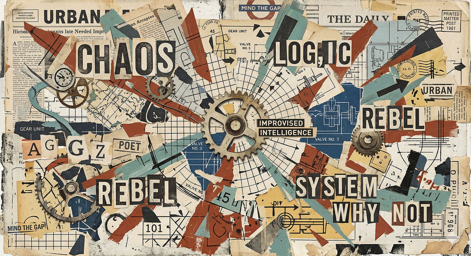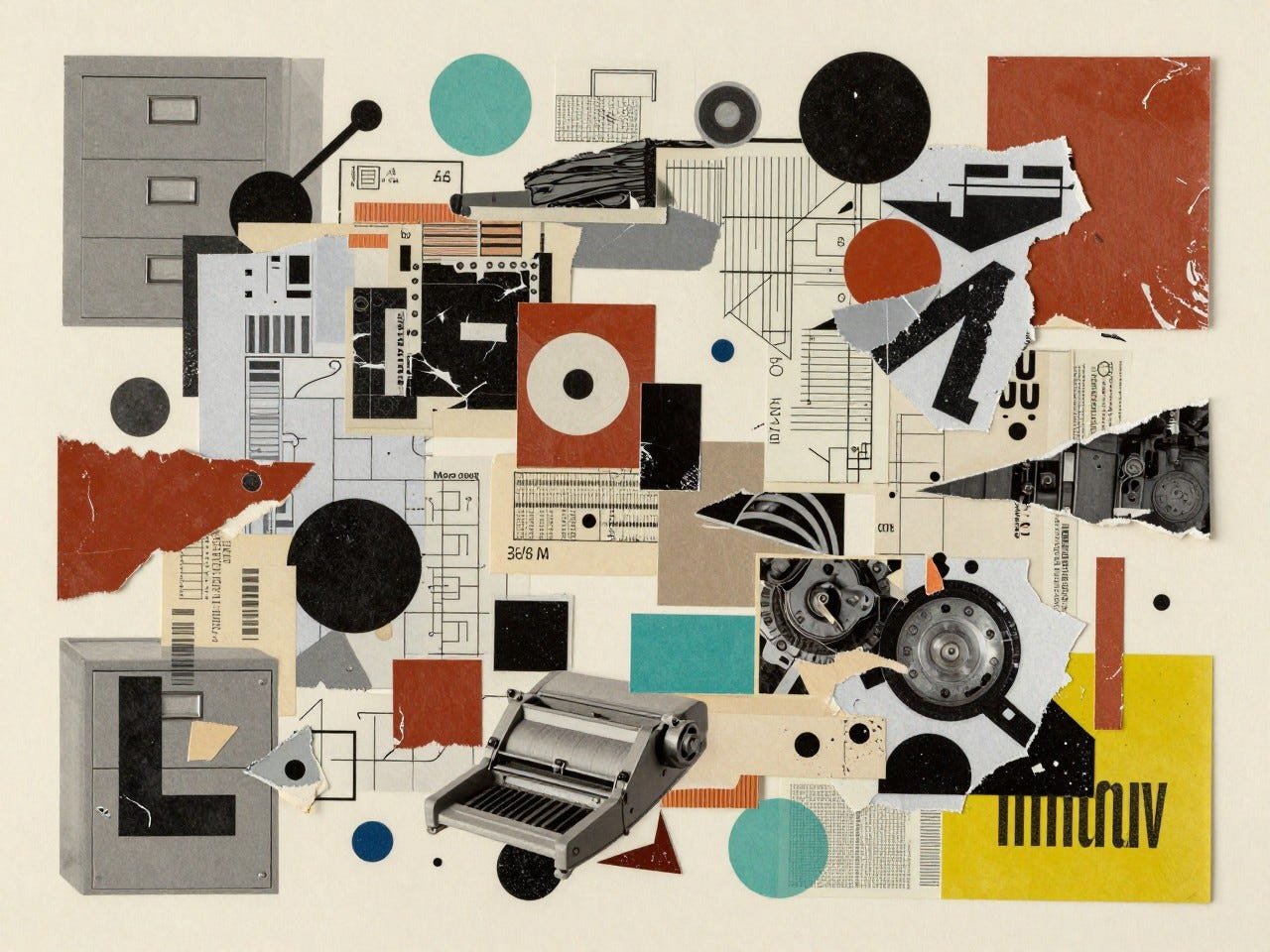 A densely layered abstract-collage composition bursting with torn paper textures, mechanical fragments, bold typographic shards, mismatched diagram pieces, postage-mark graphics, and angular painted interruptions arranged in a restless but deliberate balance. Let the image feel witty, urban, and slightly unruly, with off-kilter geometry, abrupt scale shifts, distressed surfaces, and a palette of muted cream, newsprint gray, rust red, charcoal black, faded teal, and nicotine yellow. Include crisp cut edges, scattered circles, broken grids, and eccentric overlaps that create a sense of improvised intelligence rather than chaos. The mood should feel playful, cerebral, handmade, and faintly rebellious, as if a filing cabinet, a printing press, and a very opinionated poet had collaborated in secret.
