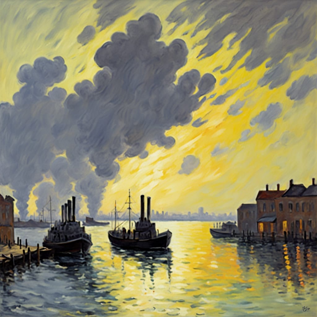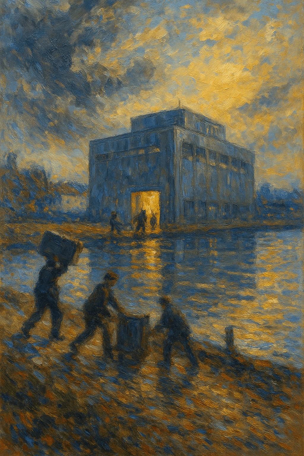 A bold Impressionist scene painted in the style of Alfred Sisley. A stormy riverside landscape with shifting clouds and splashes of color, a steel-grey data center stands across the water. It reflects on the rippling surface like a ghost of industry. Blurred figures ferry servers into a glowing doorway under a hazy golden sky, suggesting movement, purpose, and quiet defiance against big-tech norms.