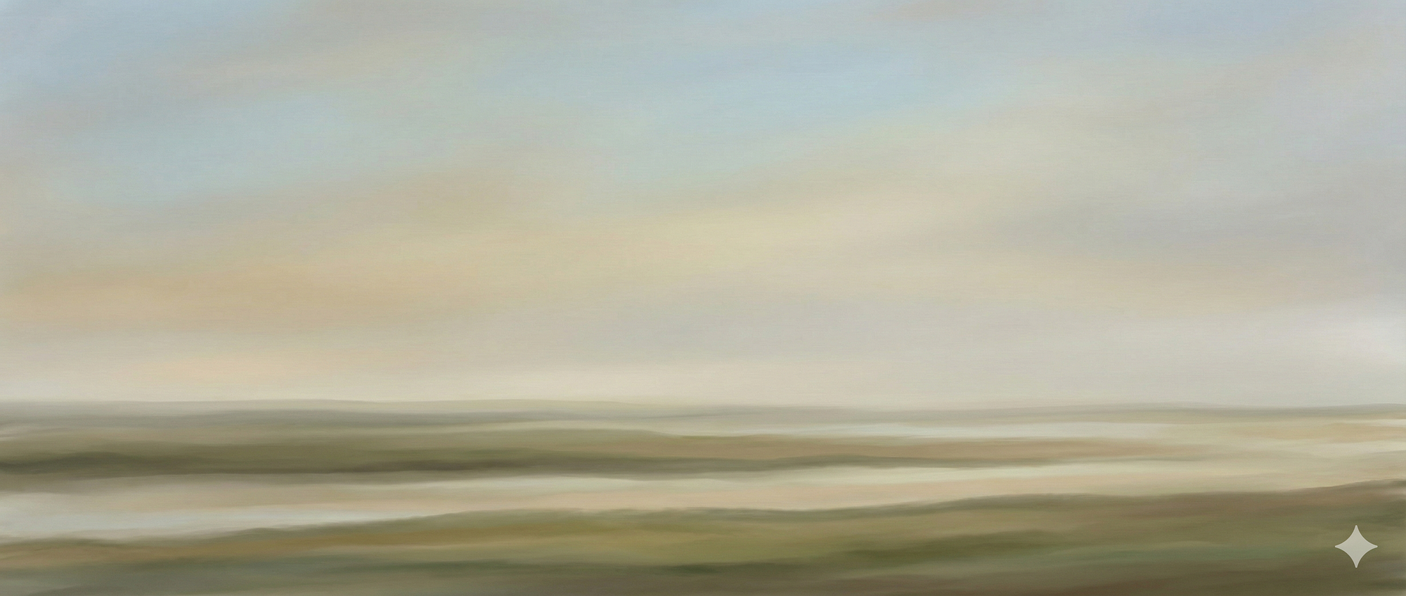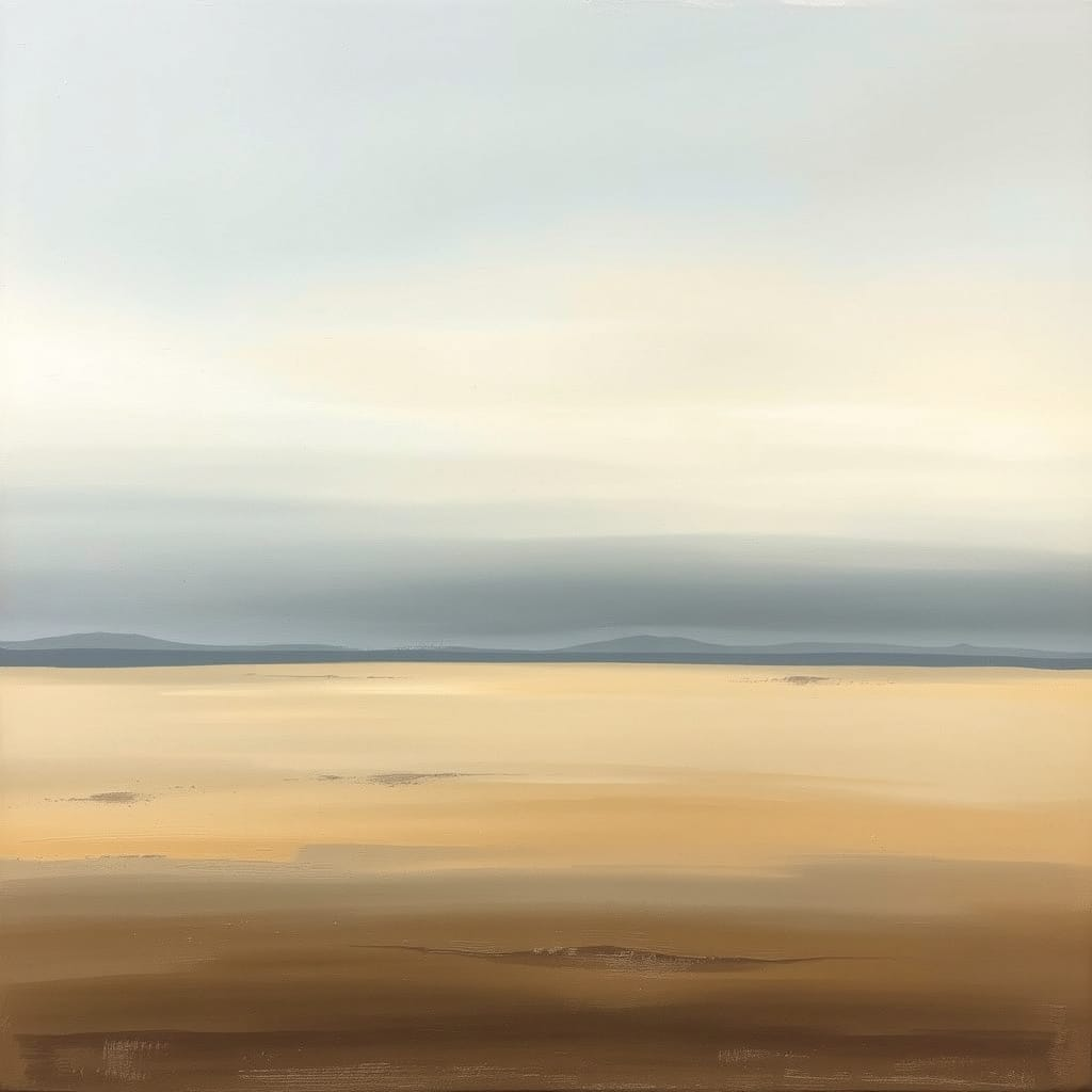 A wide, horizontal landscape composed with restraint and balance, emphasizing atmosphere over drama. The horizon sits low in the frame, giving most of the space to an expansive sky layered with soft gradients of muted blues, pale gold, and cool gray. The land below is simplified into gentle bands of texture and color, suggesting fields, water, or open terrain without sharp edges or defined structures. Brushwork is subtle and cohesive, with smooth transitions rather than visible strokes. The overall mood is quiet, deliberate, and spacious, evoking patience, clarity, and the sense of something slowly unfolding rather than arriving all at once.