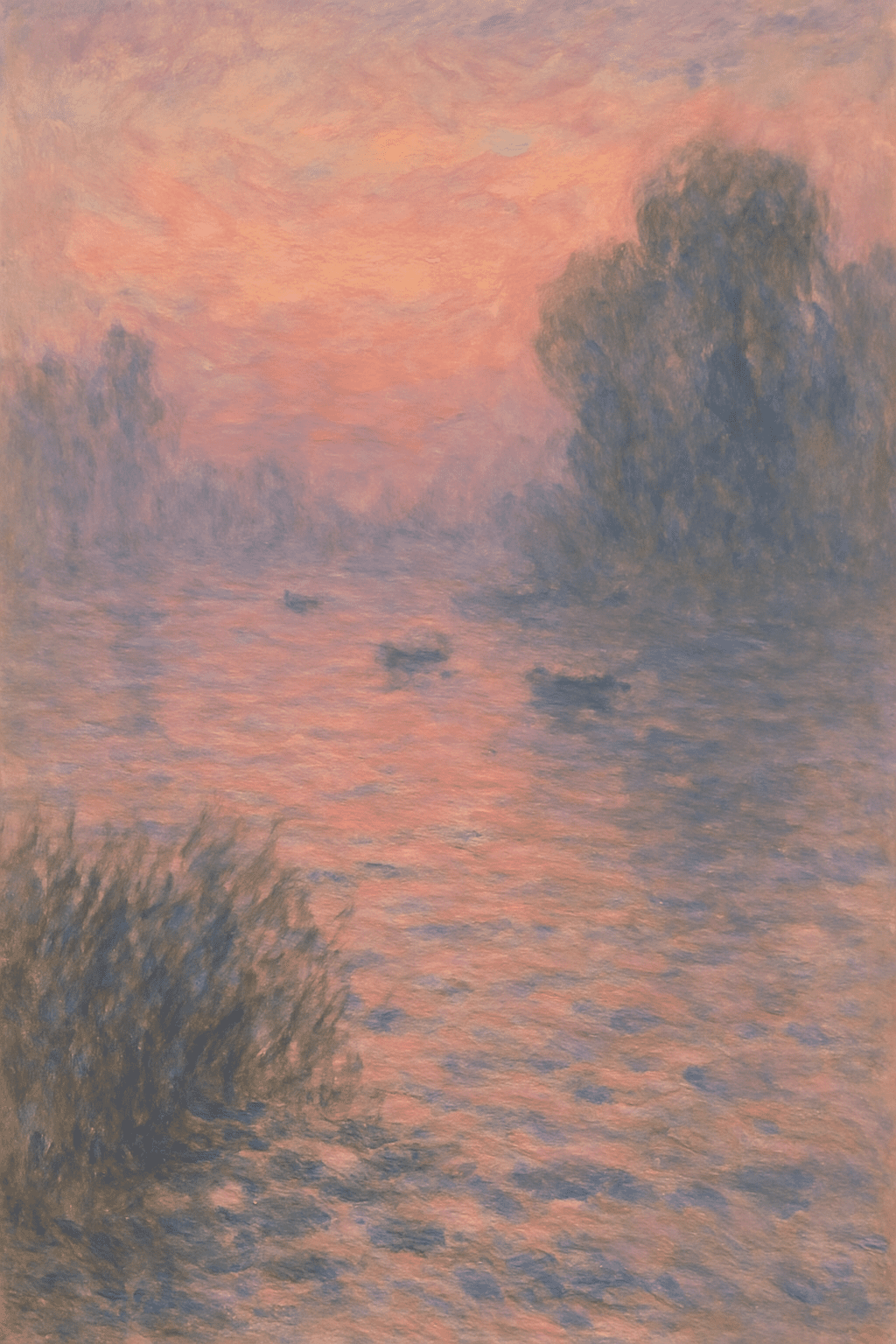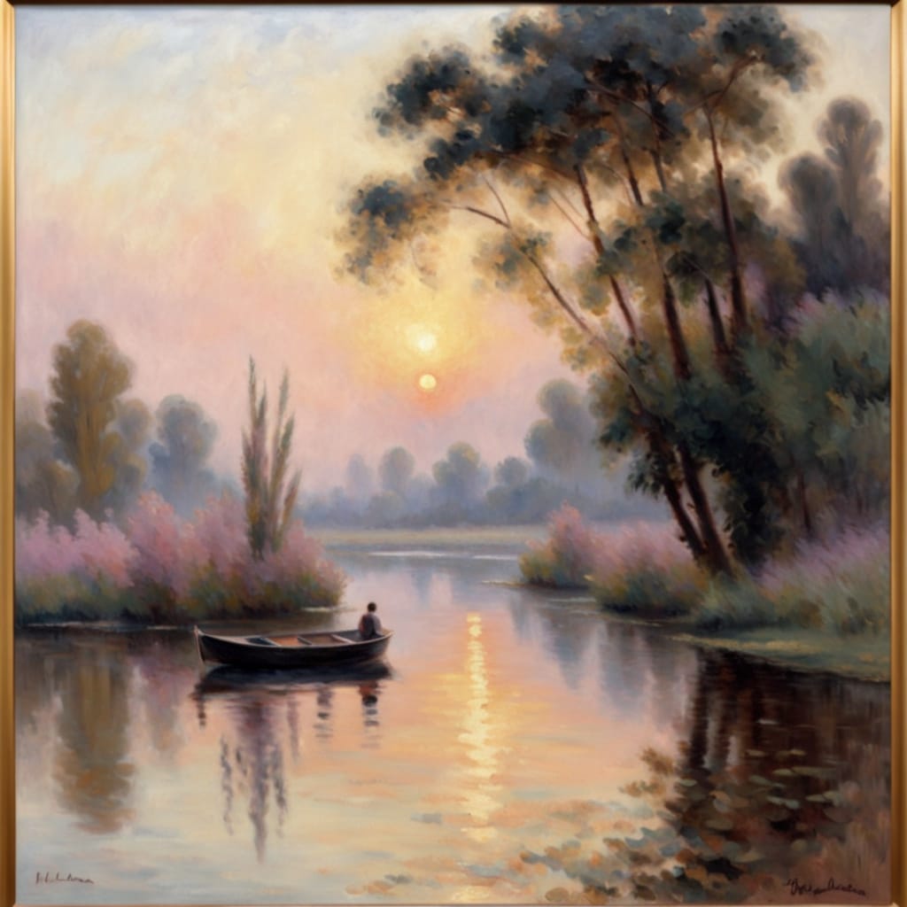A soft-focus riverside scene at dusk, painted in gentle, swirling brush strokes reminiscent of Monet’s late works. The sky glows with pink and lavender hues reflected on rippling water, dotted with small boats drifting lazily. In the foreground, reeds and lilies blur into the water with hazy texture, while tall trees on the opposite bank dissolve into the mist. Emphasize light and shadow interplay, with visible brushwork and an impression of tranquility rather than detail. Impressionist style, oil on canvas, 19th century.