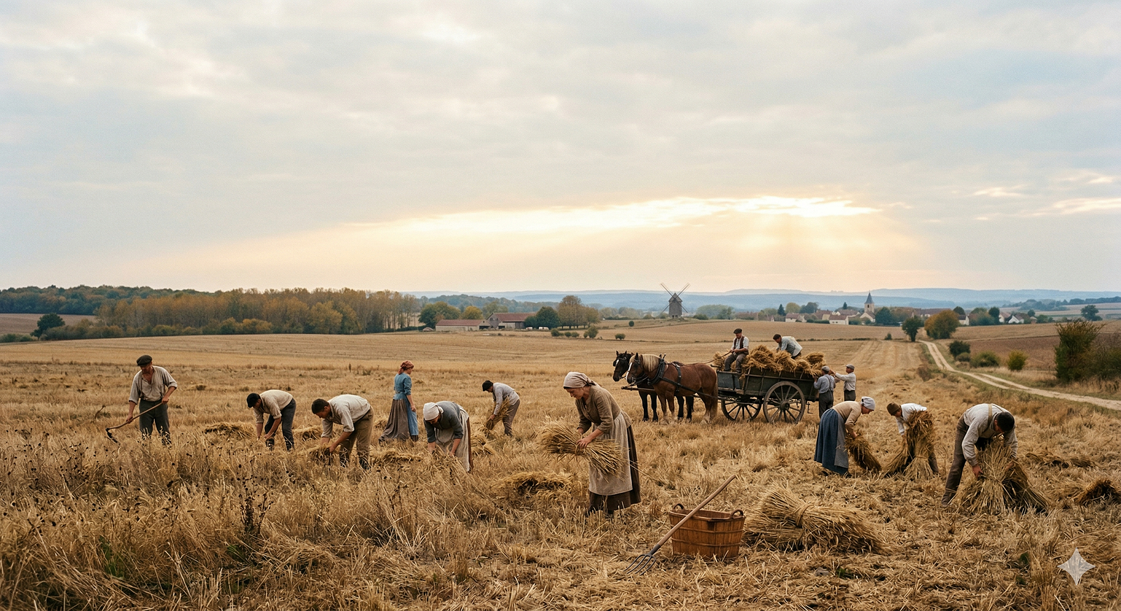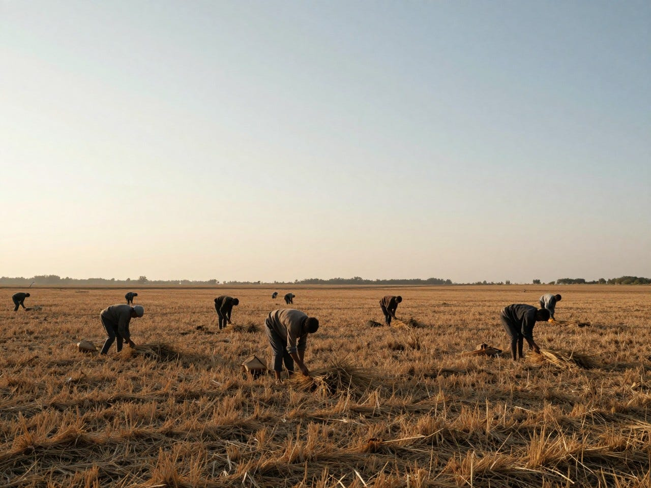 Art Prompt (Realism): A wide rural field stretches beneath a pale, luminous sky, with workers scattered low across the land gathering the last remnants of a harvested day. Use warm ochres, dusty golds, muted earth browns, soft blue haze, and a distant band of sunlit atmosphere near the horizon. The composition should feel grounded and spacious, with the figures placed low against an immense landscape so that labor, weather, and light all seem equally important. Emphasize rough natural textures, humble clothing, dry grasses, and the quiet dignity of repetitive work. Let the mood feel solemn, tender, and deeply human, with realistic proportions, restrained drama, and an almost tactile sense of heat, dust, and fading afternoon light.