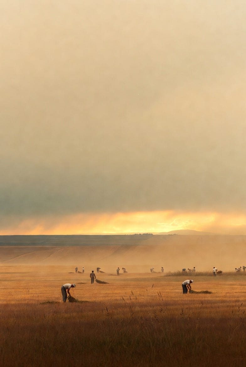 Video Prompt: Begin with a low drifting camera moving through dry stalks in the foreground as golden light slides across a broad harvested field. Small figures bend and rise in a calm rhythmic pattern while dust motes shimmer in the air and distant haystacks soften into warm haze. Let the breeze ripple through the remaining grasses, with subtle cloth motion and long shadows slowly stretching across the ground. Build in gentle cinematic motion through parallax, gliding forward movement, and a slow lift toward the horizon so the landscape gradually opens up and the quiet labor feels monumental, serene, and strangely hypnotic.