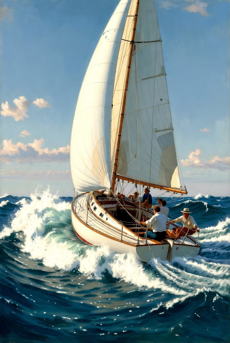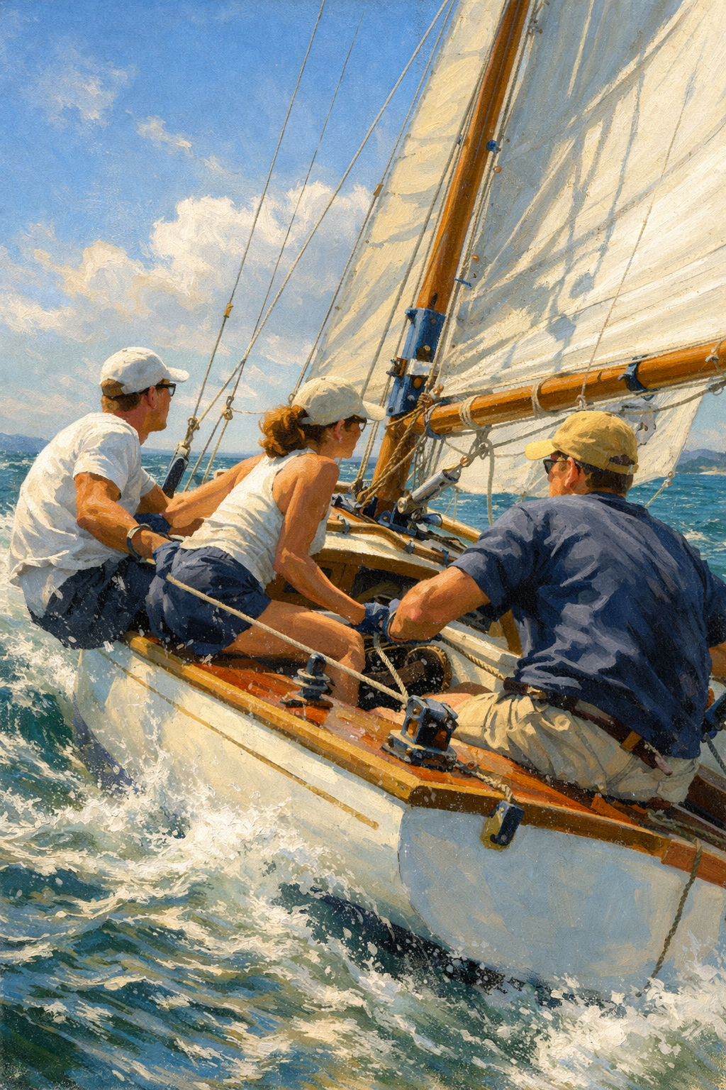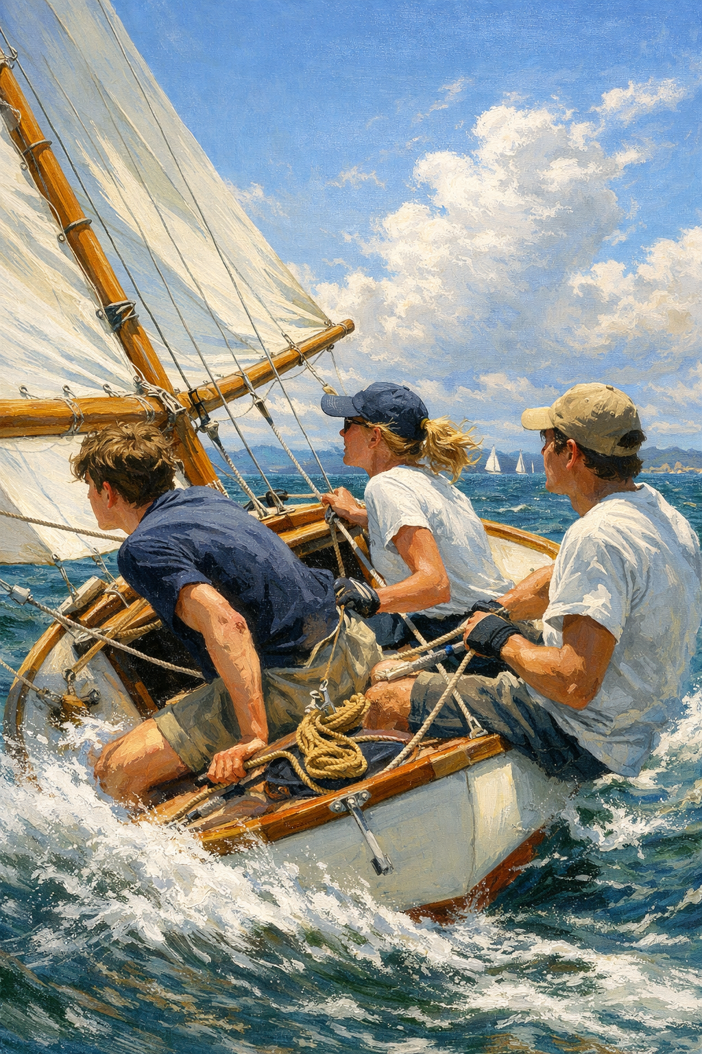 Art Prompt (Realism): A wind-bright maritime scene under a high summer sky, centered on a small racing sailboat cutting across choppy blue-green water with taut canvas straining in the breeze. Youthful figures lean and brace against the motion, their gestures natural and unposed, sun striking their sleeves, cheeks, and hat brims with crisp brilliance. The palette balances clean whites, weathered navy, warm flesh tones, and flashes of ochre in the rigging and boat trim. The composition feels open, breathable, and athletic, with a wide horizon, sparkling wavelets, and a mood of confidence, freedom, and salt-air exhilaration. Paint with sharp observational detail, natural light, and the honest immediacy of a master who loved sea, weather, and human effort in motion.