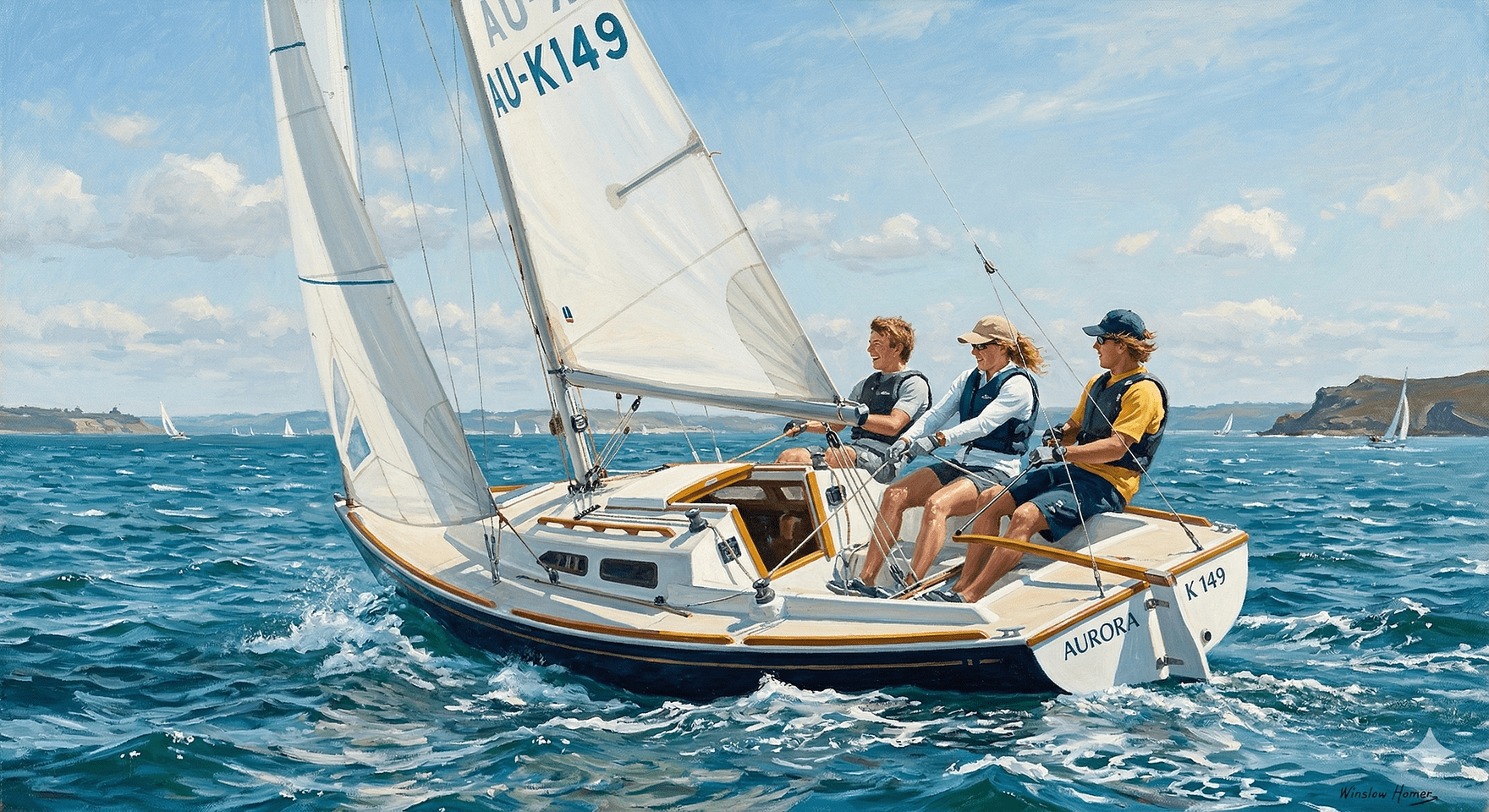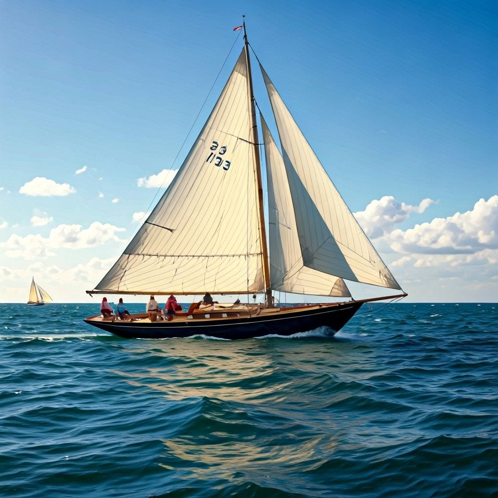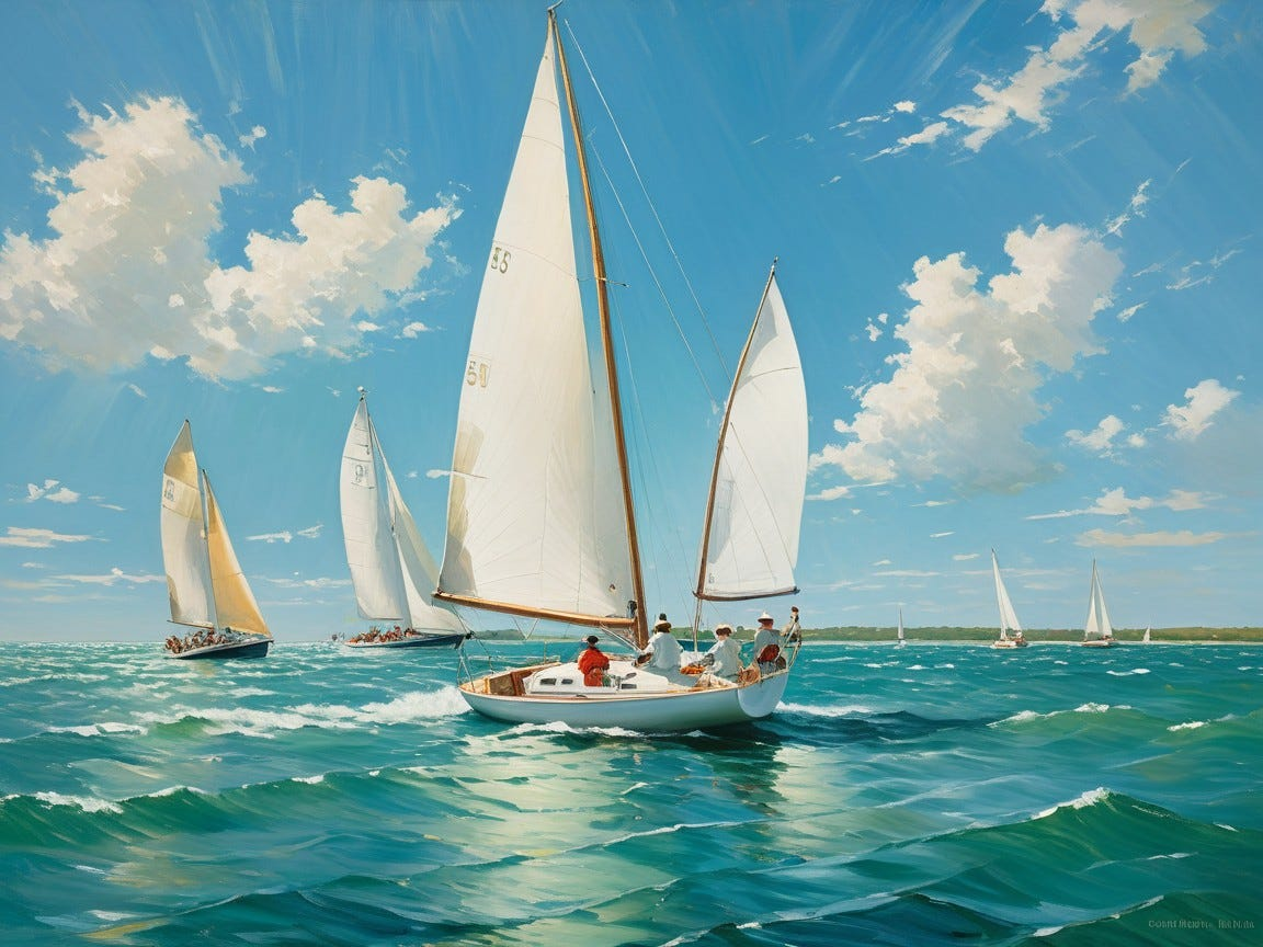 Art Prompt (Realism): A wind-bright maritime scene under a high summer sky, centered on a small racing sailboat cutting across choppy blue-green water with taut canvas straining in the breeze. Youthful figures lean and brace against the motion, their gestures natural and unposed, sun striking their sleeves, cheeks, and hat brims with crisp brilliance. The palette balances clean whites, weathered navy, warm flesh tones, and flashes of ochre in the rigging and boat trim. The composition feels open, breathable, and athletic, with a wide horizon, sparkling wavelets, and a mood of confidence, freedom, and salt-air exhilaration. Paint with sharp observational detail, natural light, and the honest immediacy of a master who loved sea, weather, and human effort in motion.