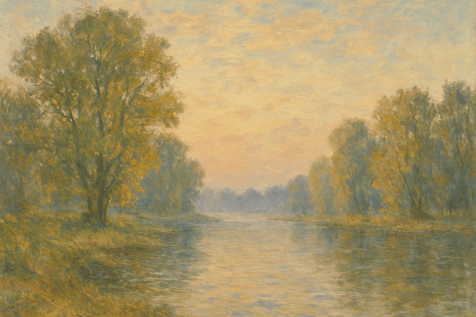 A tranquil riverside scene at dawn, where the soft light bathes the landscape in pastel hues. The water mirrors the sky’s gentle colors, with subtle ripples adding texture. Lush trees with leaves in varying shades of green and gold line the banks. The brushwork is loose and expressive, capturing the ephemeral quality of light and atmosphere. The overall mood is serene and contemplative, inviting the viewer to immerse themselves in the natural beauty of the moment.