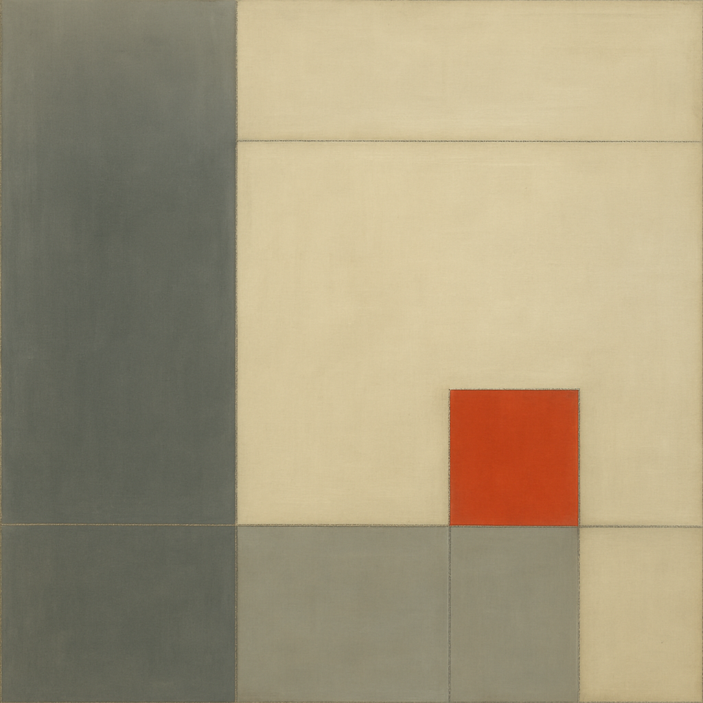 Art Prompt (Abstract Minimalism): A balanced field of quiet color planes arranged as interlocking rectangles, thin dividing lines calibrating space like a soft grid; a restrained palette of smoky grays, warm off-white, and a single ember-red block that hums at low volume; edges appear hand-tuned with barely visible feathering, surfaces matte and absorbent; composition nests a dominant vertical band on the left against a lighter, breathing expanse, inviting stillness; the mood is contemplative, poised between order and human touch, as if silence itself had structure.