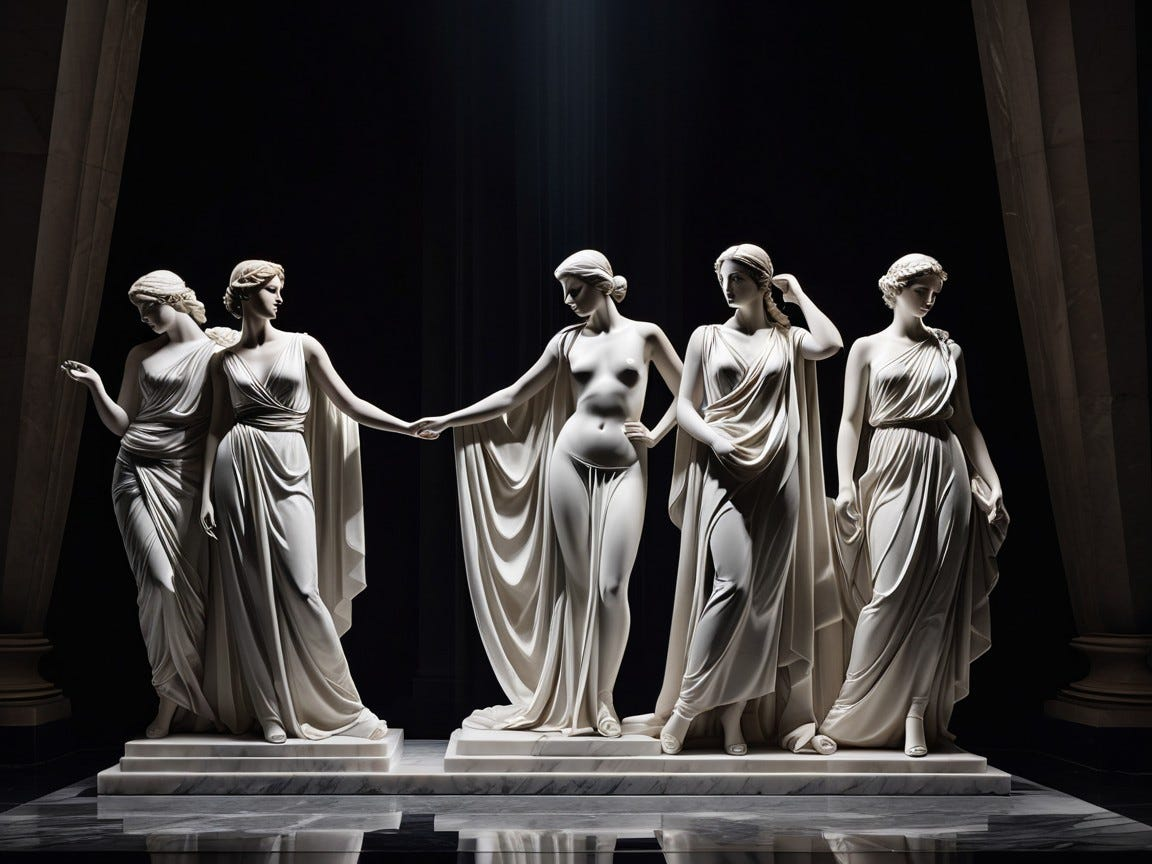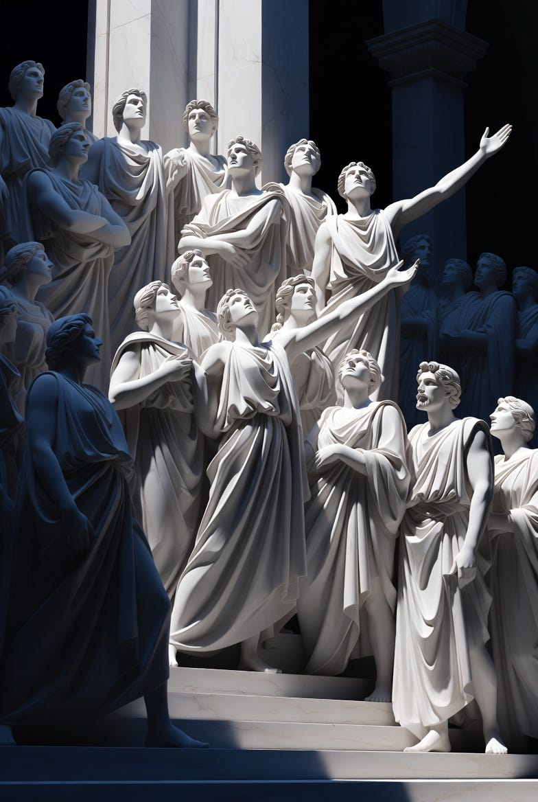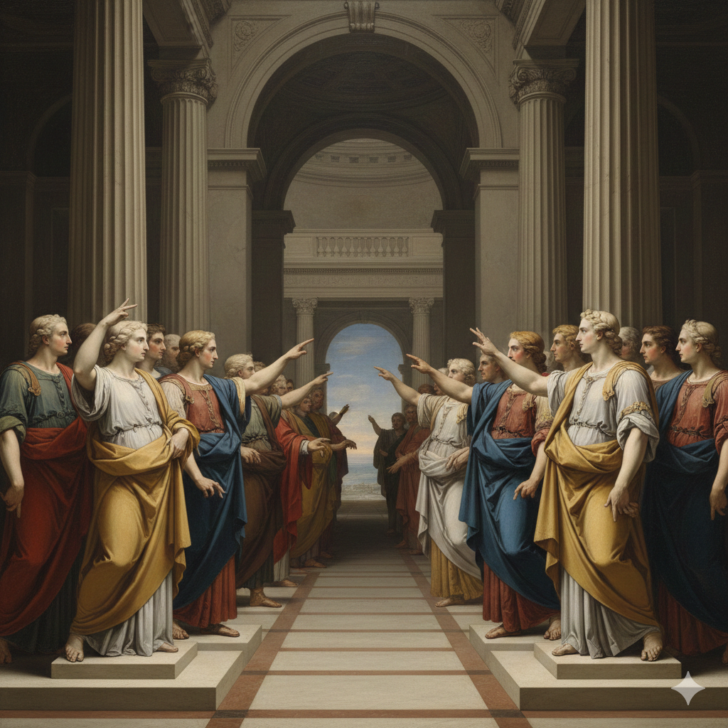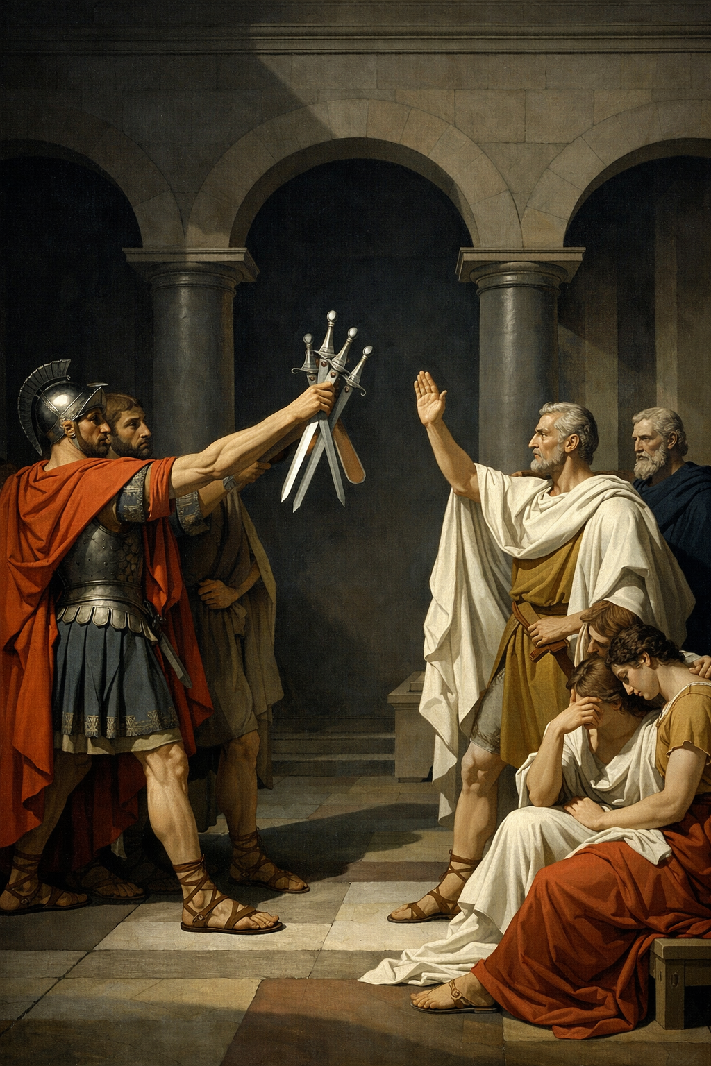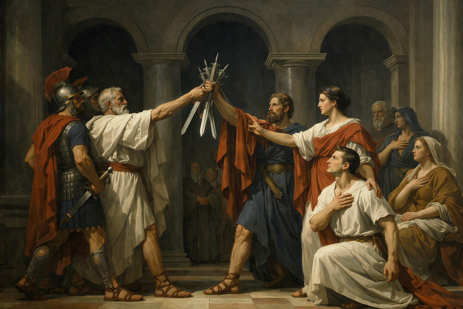 A dramatic neoclassical scene rendered with razor-sharp contours and marble-like clarity, lit by a cool, directional spotlight that sculpts every figure and fabric fold with heroic precision. The composition is orderly and symmetrical, with strong triangular groupings and decisive gestures that feel solemn and oath-bound, like a moment of civic duty frozen mid-breath. The palette is restrained and dignified: chalky whites, muted crimson, deep ink blues, and warm ochres, with crisp highlights that gleam like polished stone. Architectural elements rise in the background with severe columns and clean arches, creating a stage-like sense of grandeur. Faces are calm yet intense, emotions controlled but powerful, as if the entire scene is a lesson in discipline, resolve, and high-stakes virtue. Ultra-detailed drapery, smooth skin tones, and finely edged shadows; cinematic, statuesque, and morally serious without being gloomy.