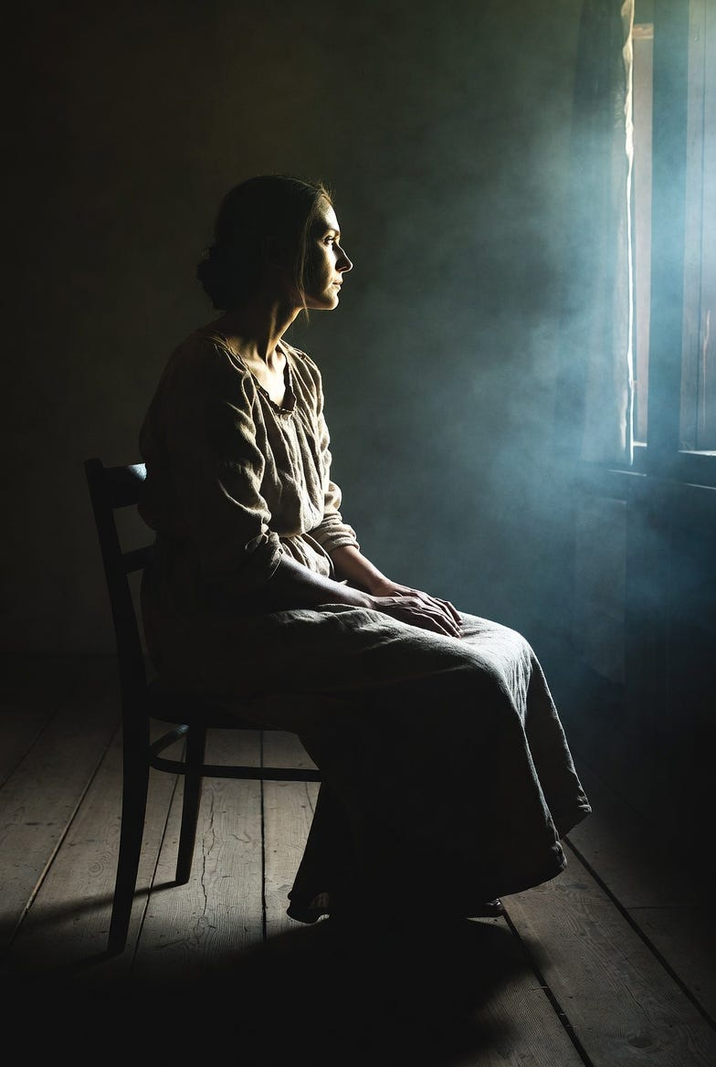 Begin with a sudden flicker of light as dust particles burst into motion in a dim rustic room, the camera quickly shifting focus from floating dust to the seated woman, subtle handheld movement creating intimacy, light intensifies in pulses as if clouds pass outside the unseen window, fabric fibers ripple slightly as if brushed by a soft draft, her eyes lift slowly toward the light, shadows stretching and contracting rhythmically across wooden floorboards, a close-up reveals delicate skin textures and the tension in her hands, the scene gradually brightens then gently dims again, ending with the room settling back into hushed stillness.
