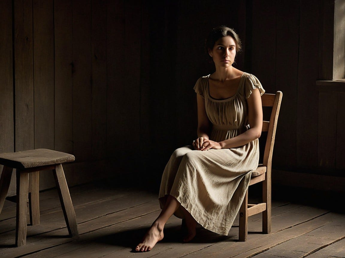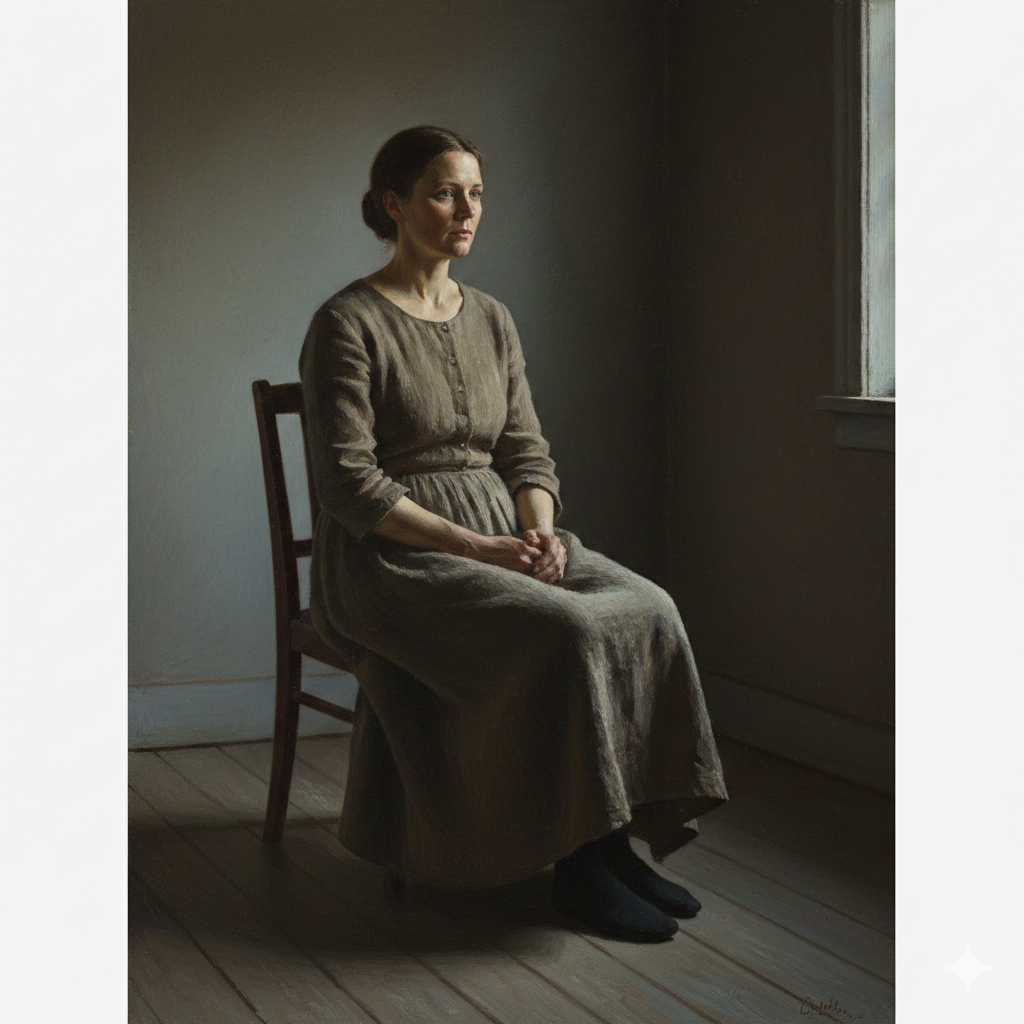 A solitary woman seated on a simple wooden chair in a dimly lit rural interior, her posture slightly slouched yet dignified, hands resting in her lap with subtle tension in her fingers, illuminated by a narrow beam of cool window light that cuts across the room, revealing the coarse texture of her plain dress and the rough grain of aged wooden floorboards, muted earth tones dominating the palette with dusty browns, deep umbers, and soft gray-blues, meticulous attention to fabric folds and skin texture, naturalistic proportions, unembellished background fading into shadow, quiet introspection in her expression, the atmosphere heavy yet tender, as if time itself has slowed in the stillness.