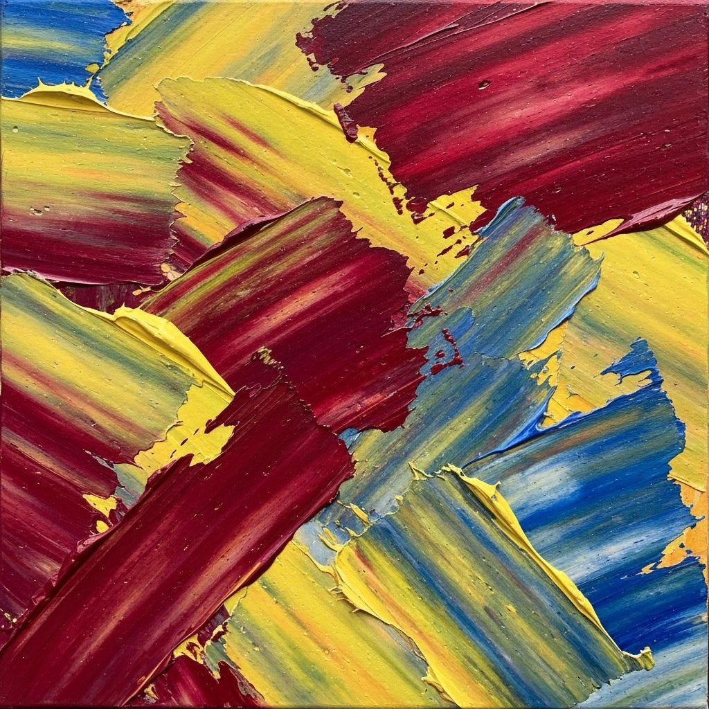 Video Prompt: Paint bursts onto the screen in rapid, forceful strokes — deep crimsons colliding with blazing yellows and cool cobalt waves. The colors fracture and merge in fast, hypnotic motion, ridges of paint catching shifting light. The camera darts between sweeping gestures and tight close-ups of textured valleys, creating an urgent, pulsing rhythm as if the canvas itself is breathing with raw emotion.
