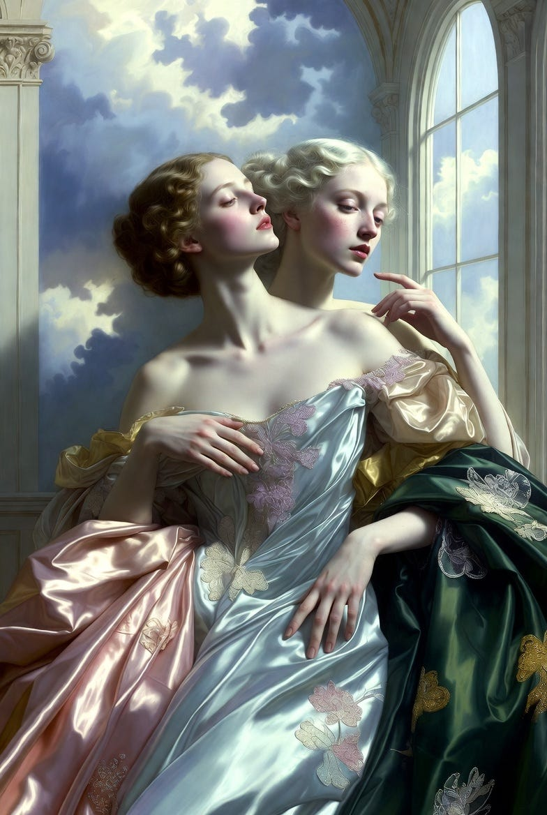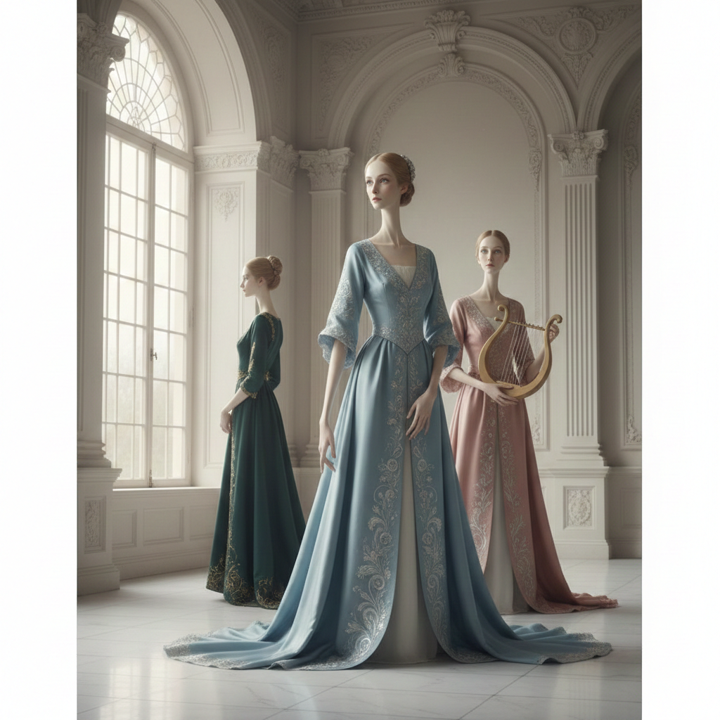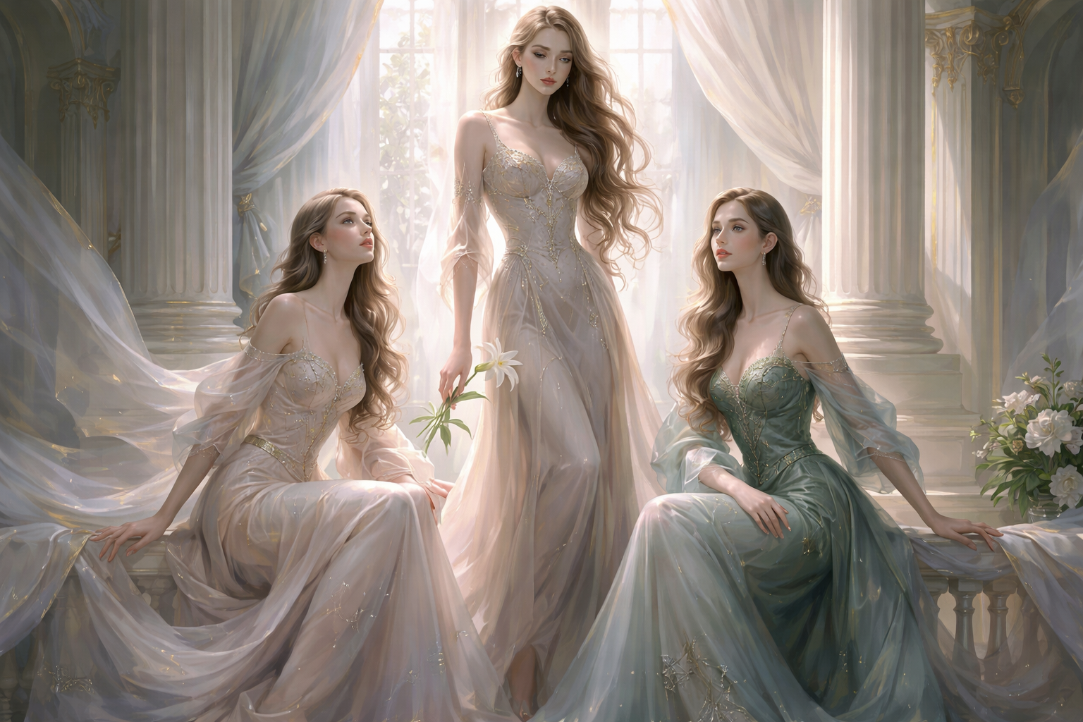 A luminous, elongated portrait scene with graceful, stylized figures posed in an airy interior beside a tall arched window. The composition feels vertically stretched, with elegant hands, swan-like necks, and subtly uncanny proportions that create a refined, dreamlike tension. Silken fabrics ripple with pearly highlights, embroidered details, and cool pastel shadows. The palette is sophisticated and slightly surreal: pale alabaster skin tones, misty blues, soft rose, muted gold, and deep evergreen accents. Lighting is gentle and theatrical, as if filtered through thin clouds, producing a polished glow and delicate gradients. The background architecture is classical but softened, with smooth columns and ornamental flourishes that feel decorative rather than heavy. The mood is poised and enigmatic: serene faces, distant gazes, and an atmosphere of aristocratic calm with a whisper of strangeness.