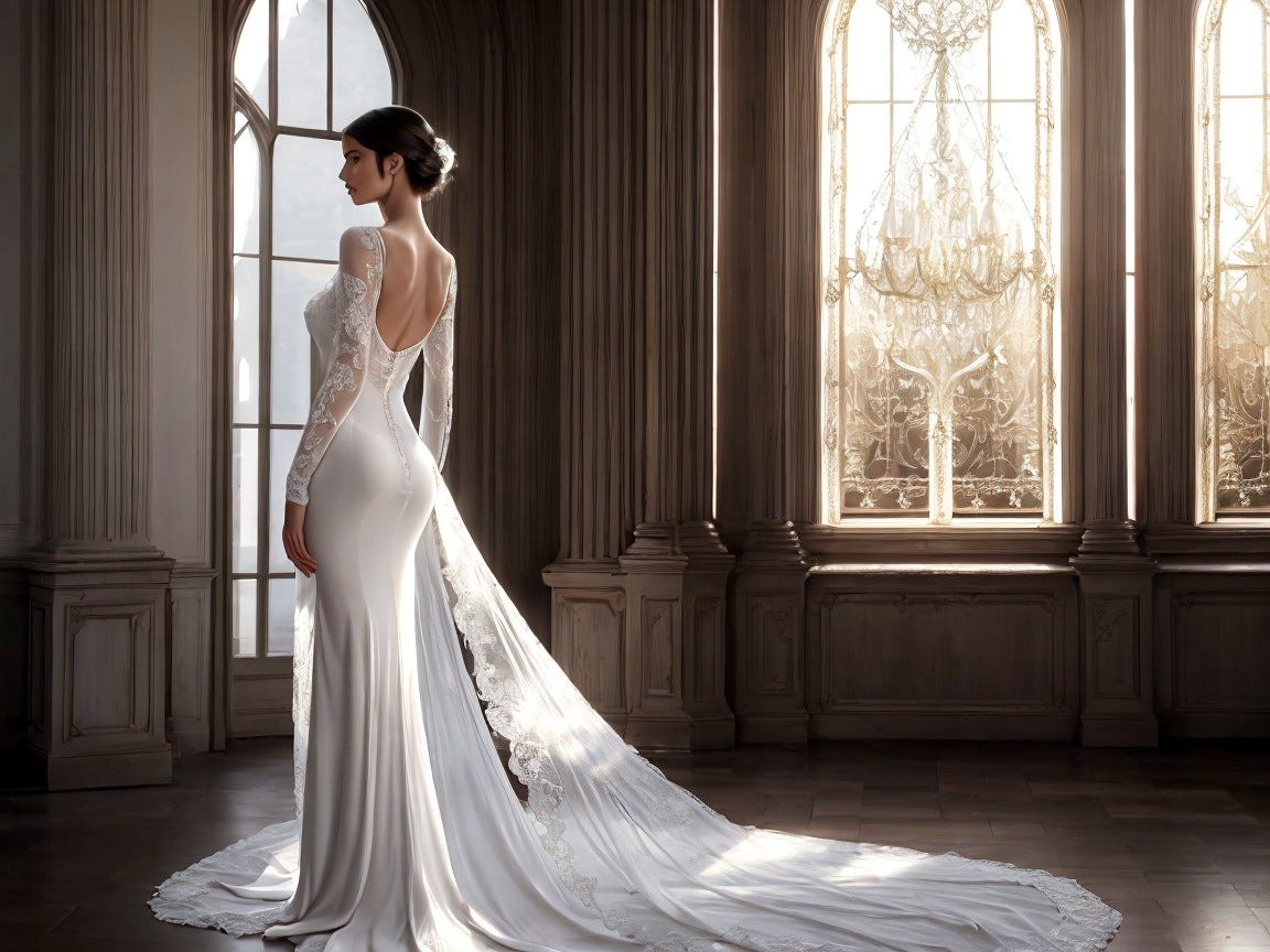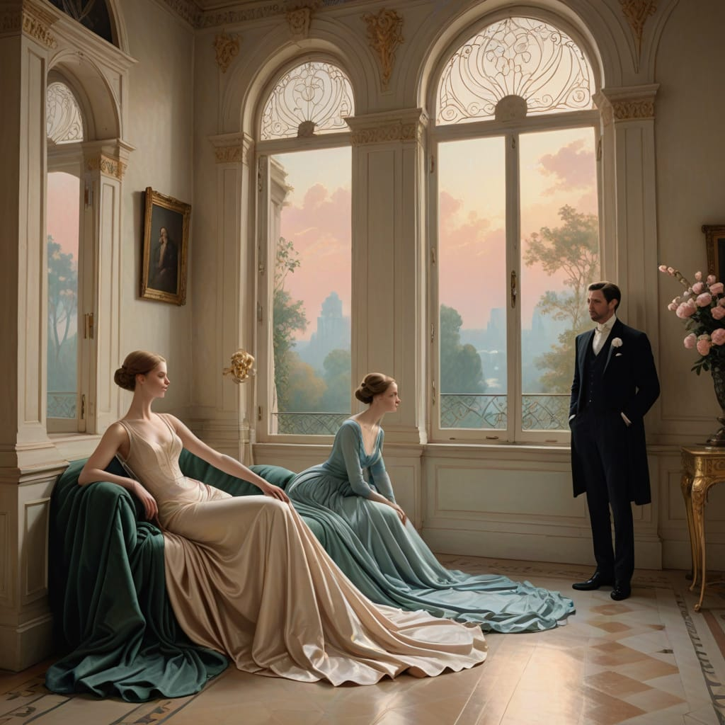 Open with a sudden snap-focus reveal of the tall arched window as light flickers like a soft pulse through thin clouds. The figures subtly shift their posture in stylized, elegant motions: a slow, graceful turn of the head, a delicate hand lifting as fabric ripples in a silky wave, and embroidered details shimmering as if catching tiny sparks of light. Add a rhythmic “breathing” effect to the scene where the highlights gently expand and contract, making the whole image feel alive. Use quick, tasteful micro-zooms to emphasize the elongated hands, the swan-like neck lines, and the pearly sheen of the fabrics. Introduce brief, smooth parallax movement between the foreground figures and the softened architectural columns to create depth. End with a crisp, dramatic tilt upward toward the window glow as the palette intensifies for a beat, then settles back into calm.