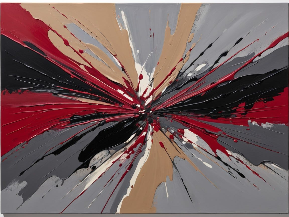 A vast canvas ripples with bold, gestural strokes of black and crimson, layered over swaths of muted ochre and steel gray. The paint seems to drip and collide mid-motion, each stroke alive with tension, raw energy, and unresolved chaos. Negative space breathes between violent slashes of pigment, creating a rhythm that feels improvised yet deeply intentional. The surface radiates intensity, like a frozen improvisation of pure emotion, balanced between destruction and creation.