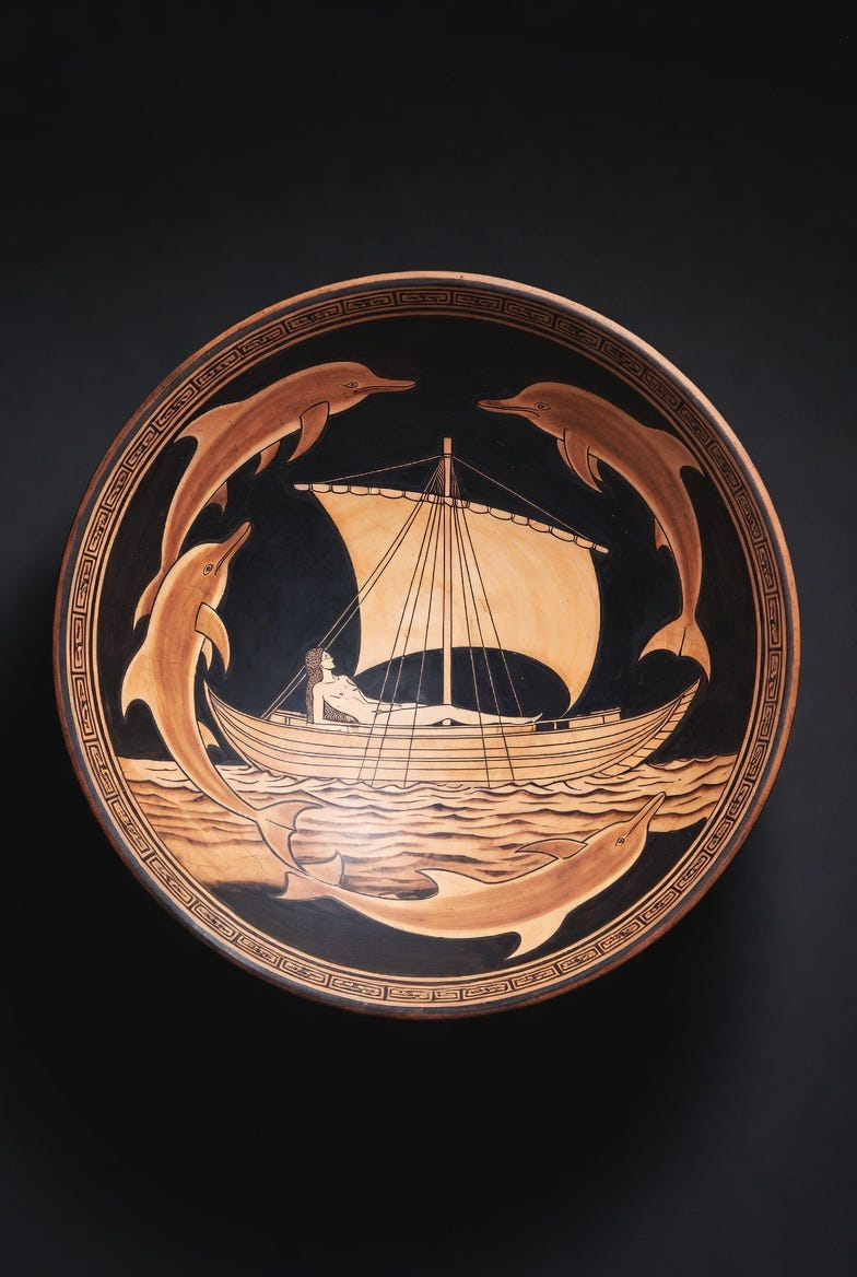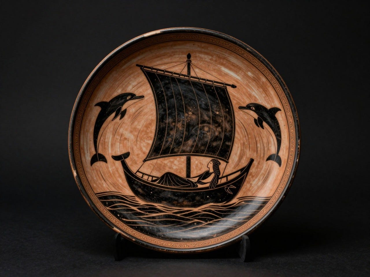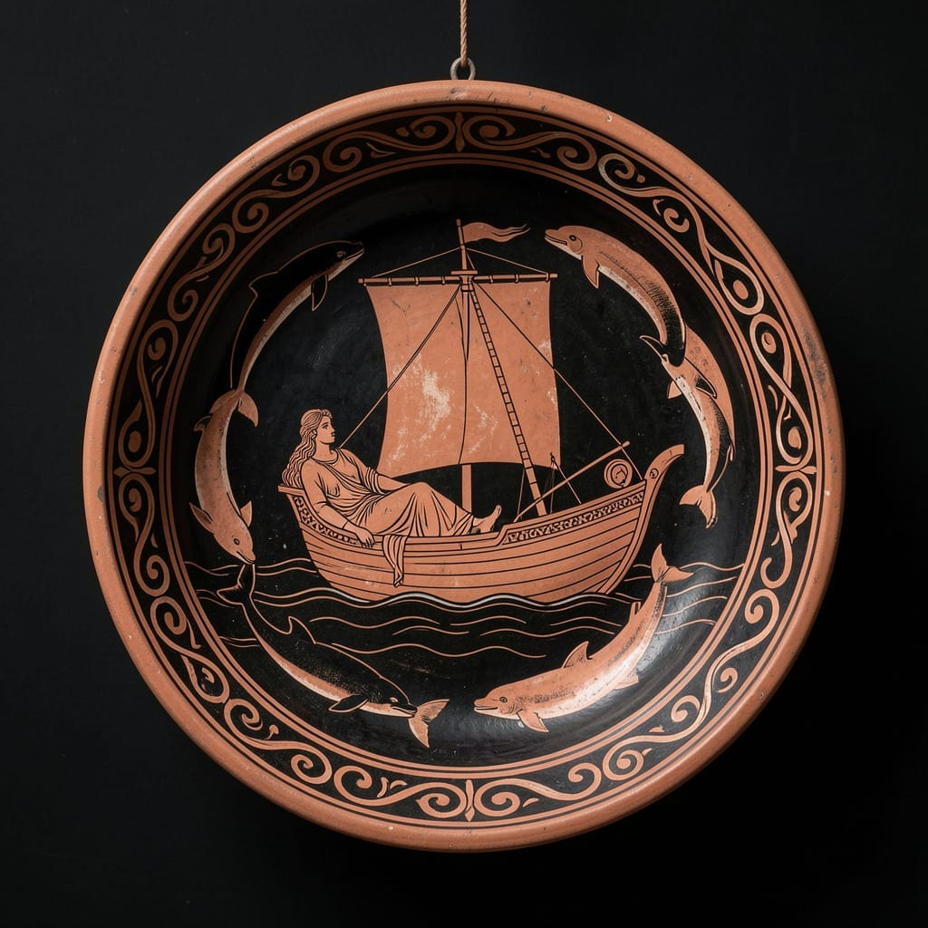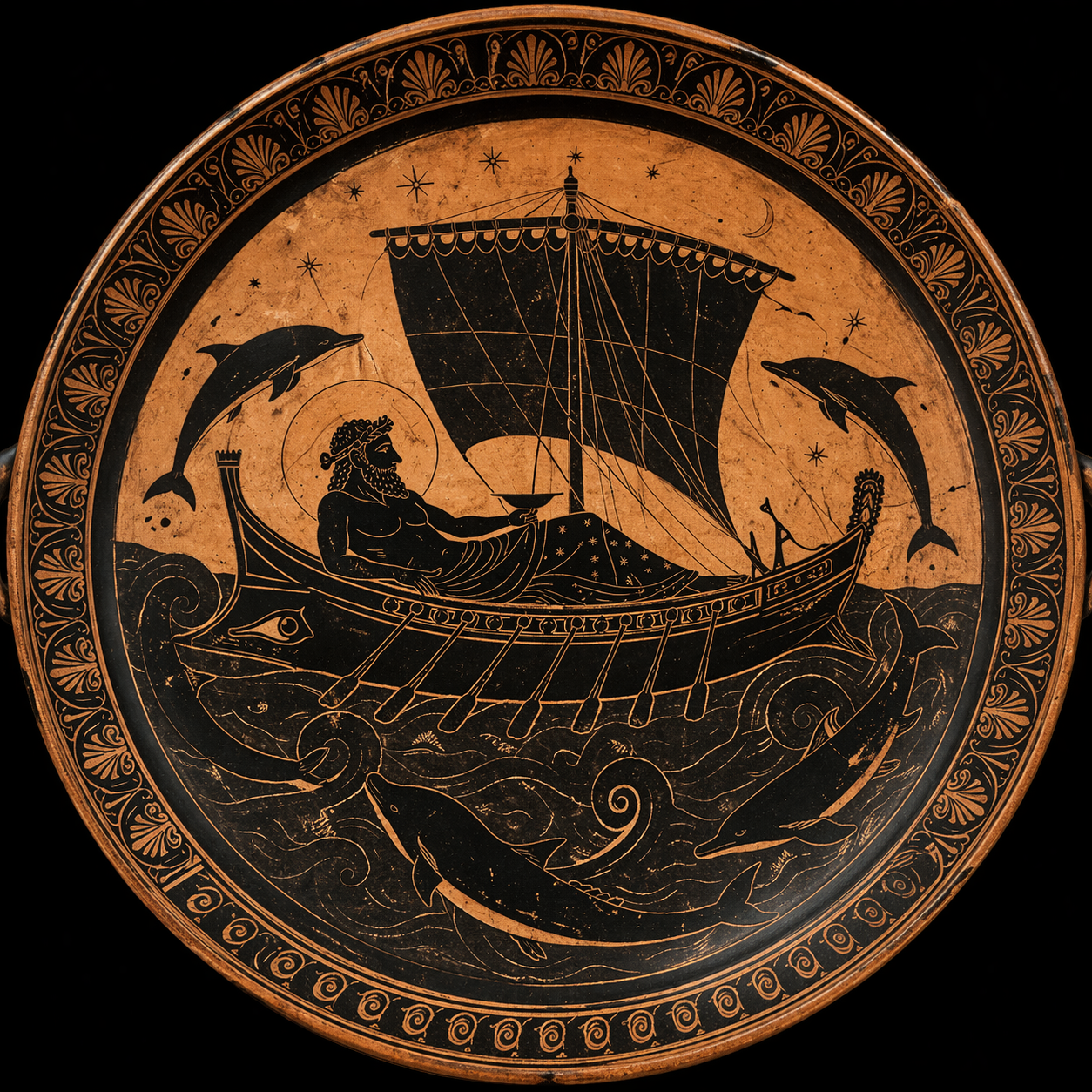 A circular painted vessel interior suspended against a deep matte black field, centered on a long narrow ship gliding across stylized wine-dark water. A serene divine figure reclines beneath a square sail while sleek dolphins curve around the hull in rhythmic arcs, their bodies forming a graceful ring of motion. Render the scene in lustrous black-figure pottery style with warm terracotta clay, razor-sharp incised contour lines, restrained pale highlights, and elegant ornamental bands hugging the rim. Keep the composition balanced, ceremonial, and graphic, with crisp silhouettes, mineral texture, fired-earth warmth, and a faint sense of age polished by centuries. The mood should feel calm, sacred, mysterious, and quietly exuberant, as if myth has been flattened into geometry without losing any of its pulse.