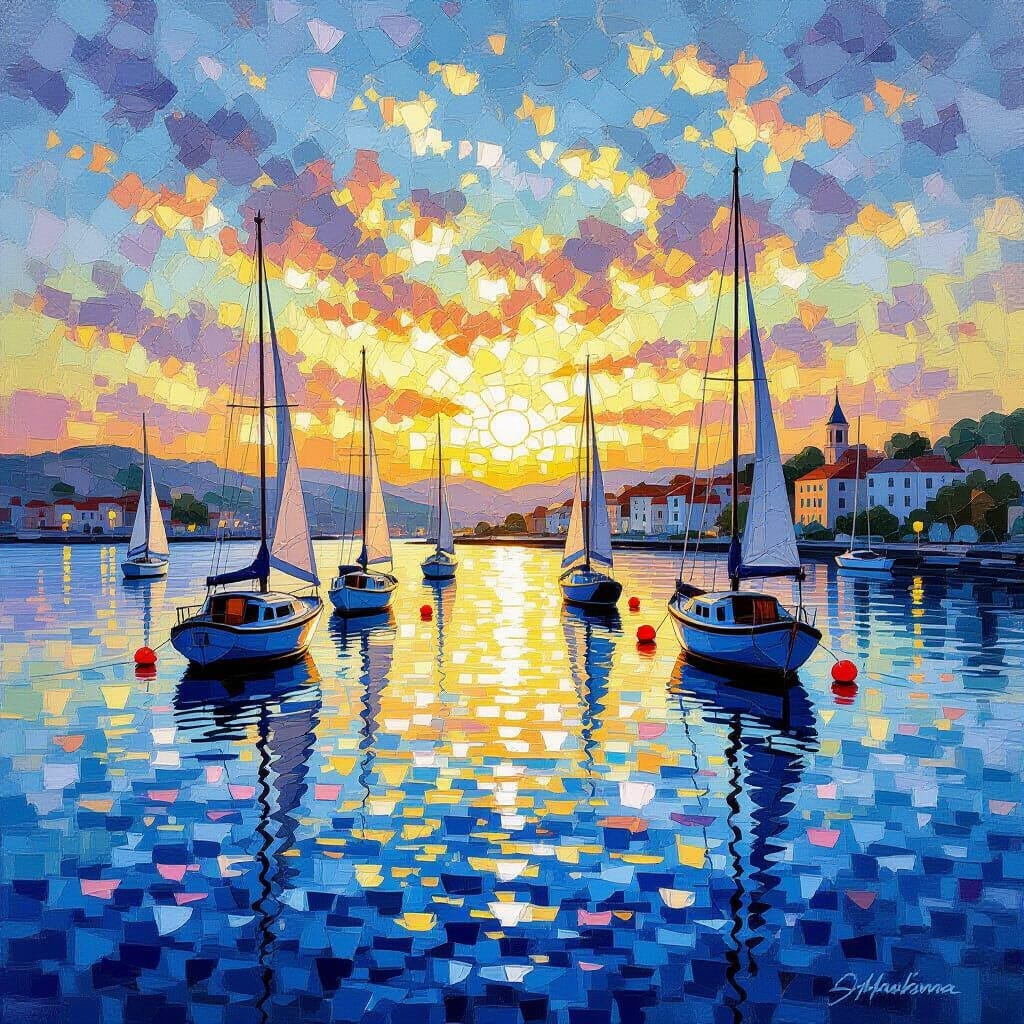 Art Prompt (Pointillism): A luminous coastal harbor scene composed entirely of tiny, deliberate dots of pure color, where sunlight fractures into shimmering blues, soft lilacs, warm golds, and gentle greens. Sailboats drift calmly across reflective water, their forms suggested rather than outlined, blending into a vibrant atmosphere that feels alive with motion despite its stillness. The composition balances precise structure with airy openness, creating a calm, meditative mood as if the air itself is sparkling. The horizon glows subtly, and the entire image hums with quiet energy and refined optimism.