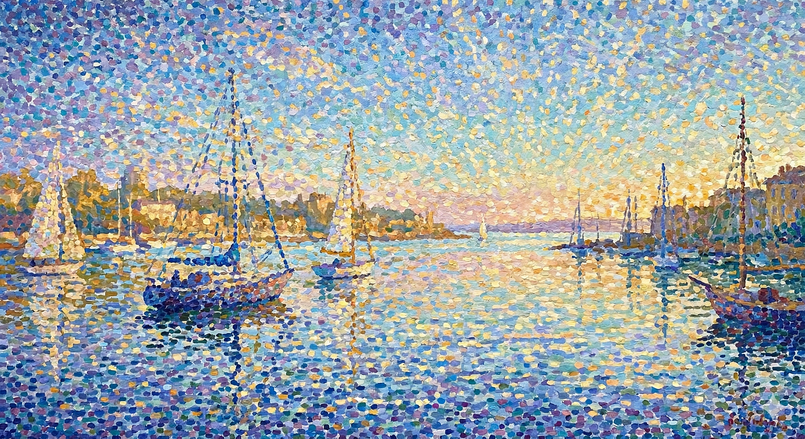 Video Prompt: Transform the scene into a living mosaic where countless points of color subtly pulse and ripple. The water glitters as dots gently shift and reassemble, sailboats gliding forward as if carried by invisible currents. Sunlight flickers rhythmically across the surface, with colors breathing in and out to create hypnotic motion. The camera weaves lightly through the scene, creating a sense of immersion and momentum without ever feeling rushed, as if the painting itself has decided to exhale.