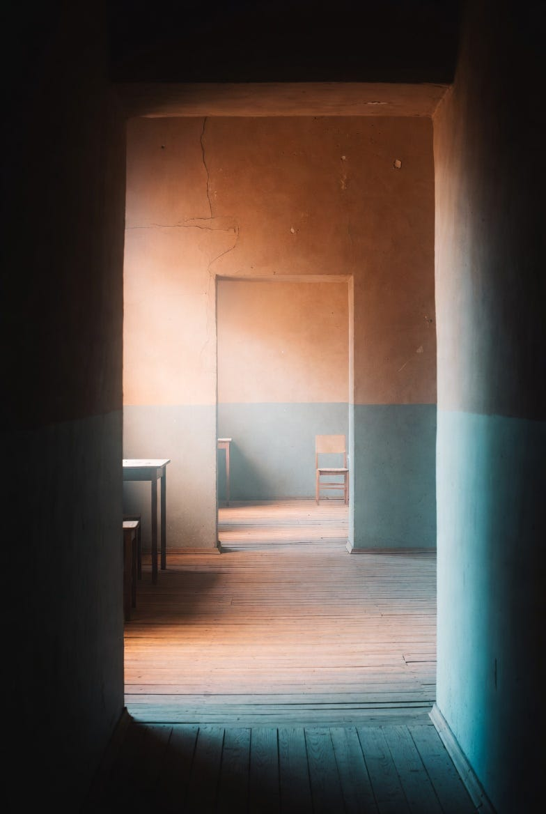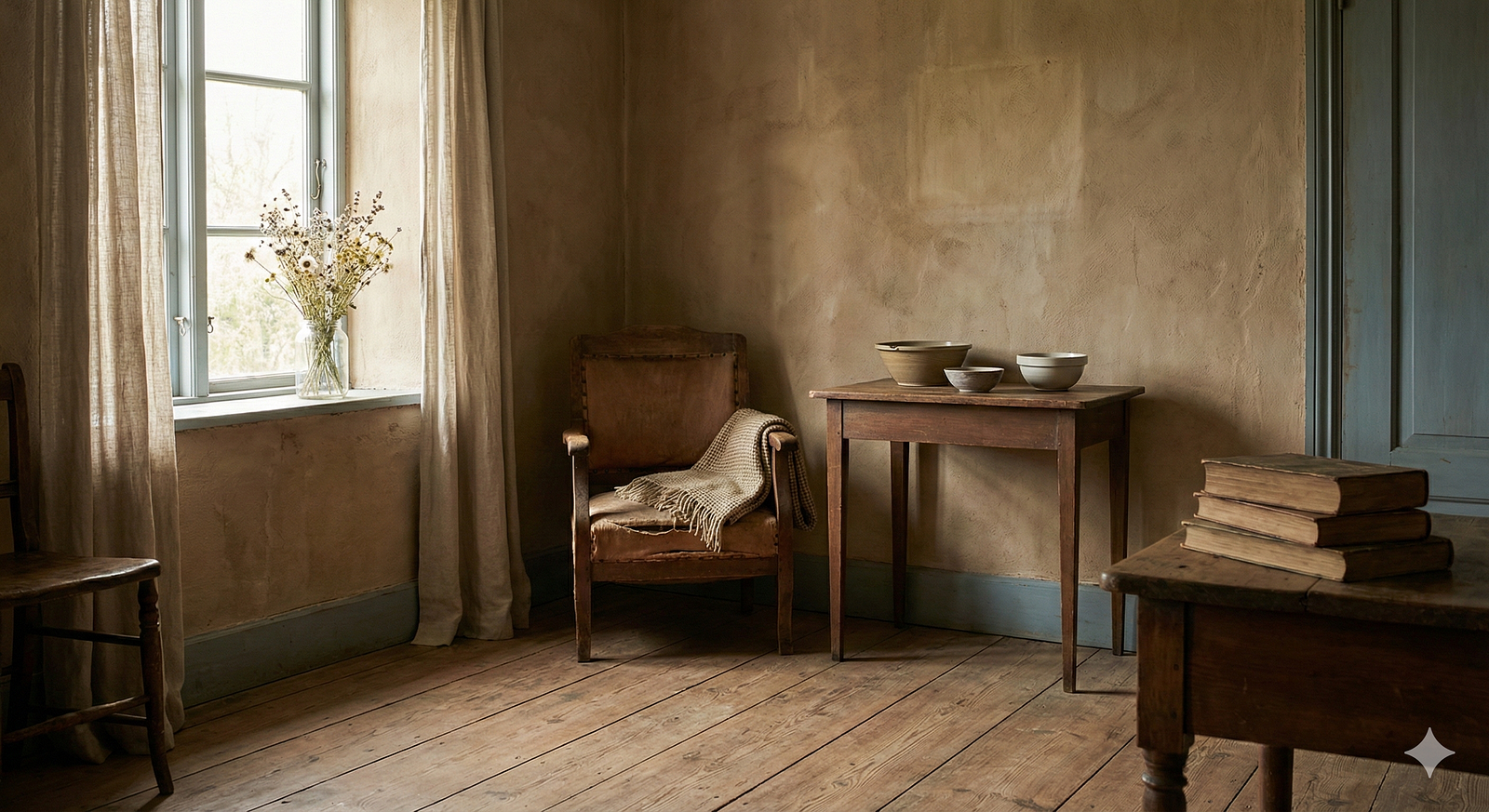 Video Prompt: Bring the scene to life with drifting light that shifts naturally across surfaces, dust motes floating gently in the air, and slow changes in shadow that suggest the passage of time. Introduce subtle camera movement that feels like a thoughtful observer stepping through the space, with small details coming into focus and receding again, creating a meditative rhythm designed to hold attention through continuous, understated motion.