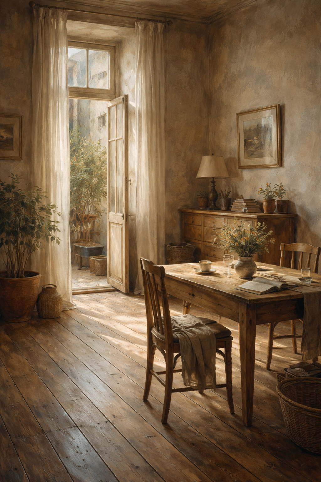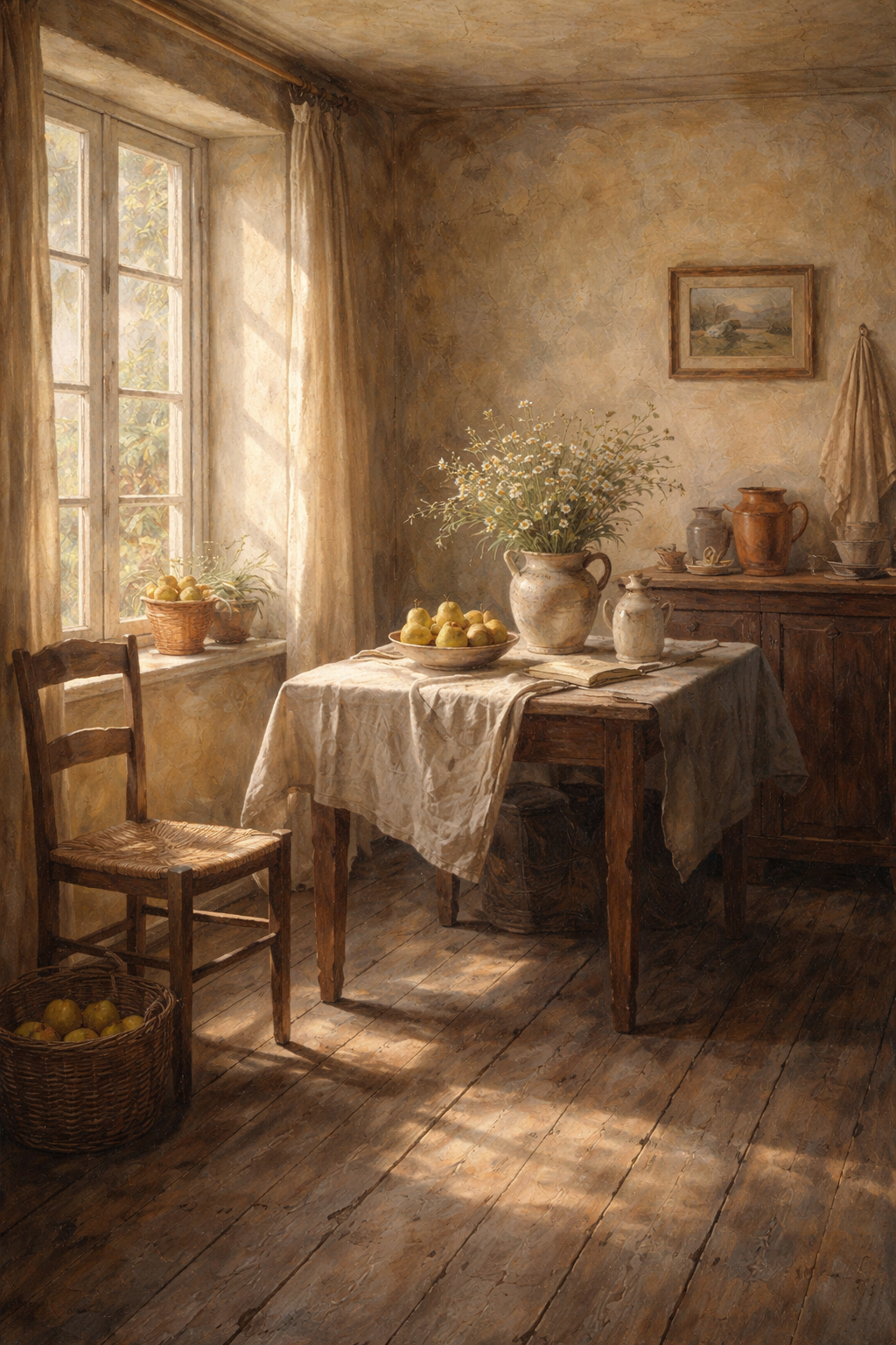 Art Prompt (Realism): A sunlit interior scene rendered with meticulous natural detail, featuring soft, diffused daylight spilling across worn wooden floors and textured plaster walls. Subtle earth tones dominate the palette, with muted blues, warm ochres, and gentle shadows creating depth and stillness. The composition feels intimate and observational, capturing ordinary objects arranged with quiet intention, painted with restrained brushwork and an unembellished honesty that emphasizes realism, atmosphere, and calm presence.