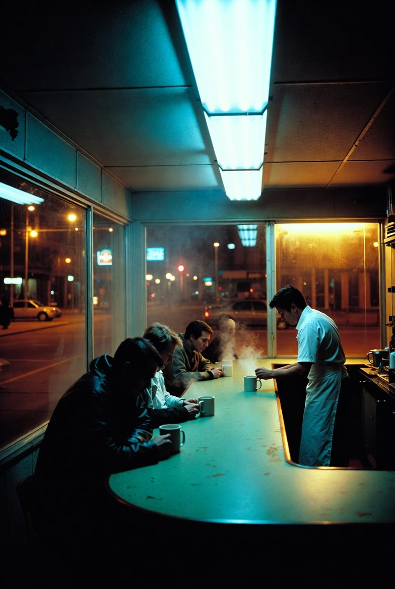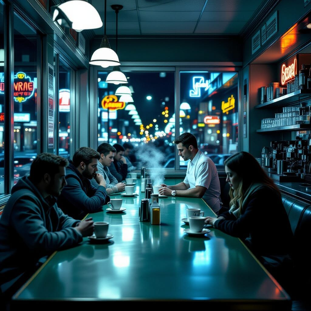 Art Prompt (Realism): A late-night urban diner interior bathed in harsh fluorescent light, with a handful of solitary patrons hunched over steaming mugs at a long green counter, a lone server in a crisp white apron behind the bar, large plate-glass windows framing a deserted city street at midnight with glowing neon reflections, hyper-realistic details capturing every texture from the worn linoleum floor to the faint steam rising from coffee cups, palette of cool blues and warm yellows creating a poignant atmosphere of quiet solitude and everyday introspection.
