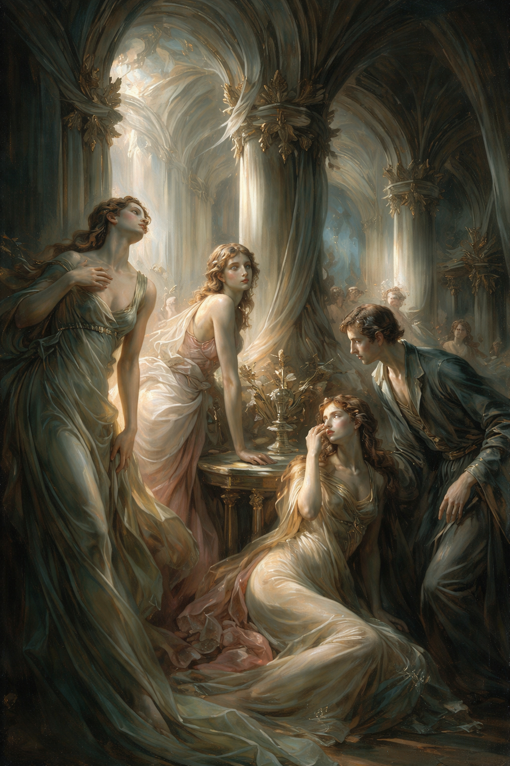 Video Prompt: Transform the scene into a living tableau where figures slowly shift poses with fluid, almost balletic motion. Fabrics ripple as if stirred by unseen currents. Architectural lines subtly flex and realign, creating a hypnotic sense of movement. Light pulses gently across the scene, emphasizing faces and hands in rhythmic intervals. Occasional close-in motion draws attention to expressive gestures before drifting back into the full composition, maintaining an elegant, surreal energy throughout.