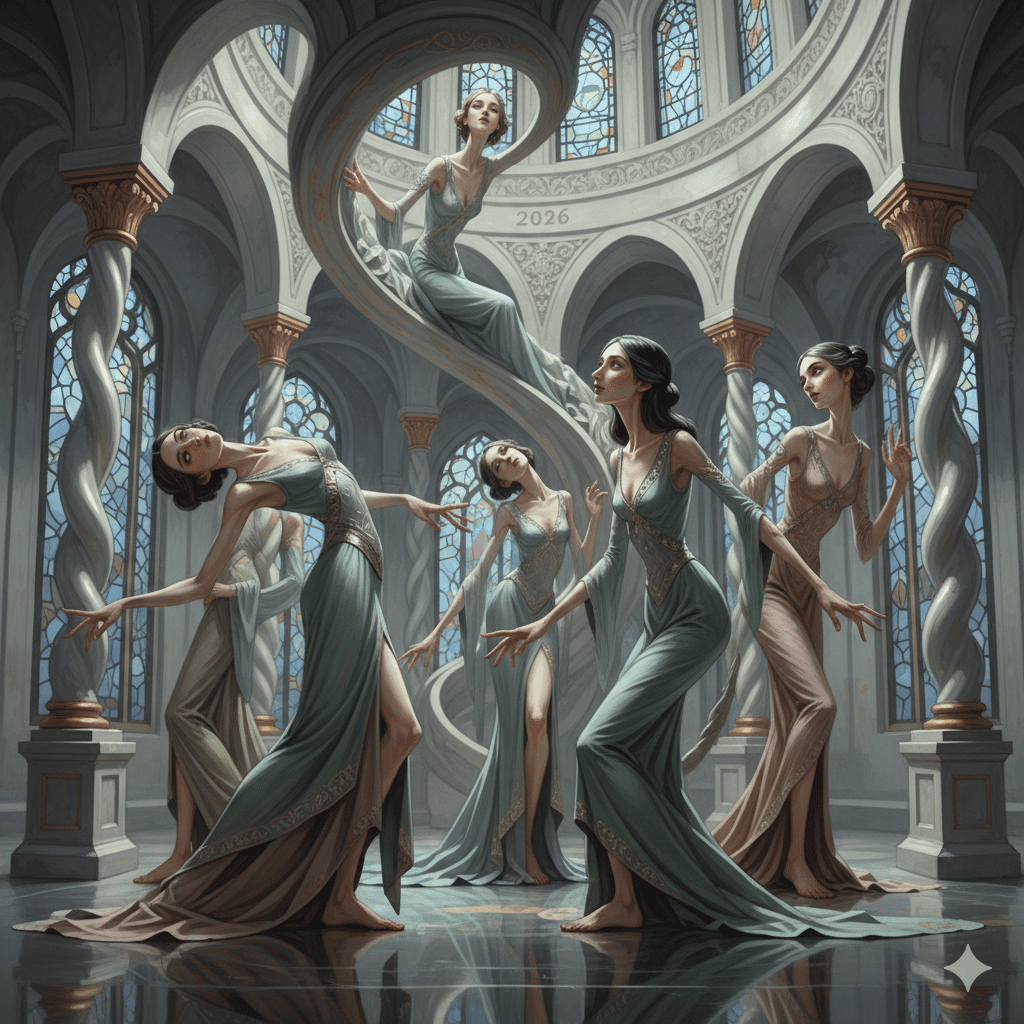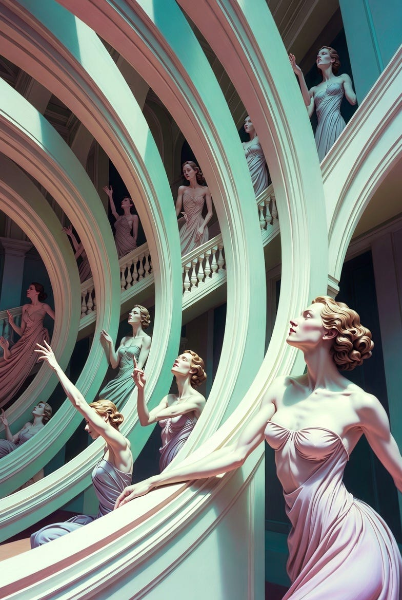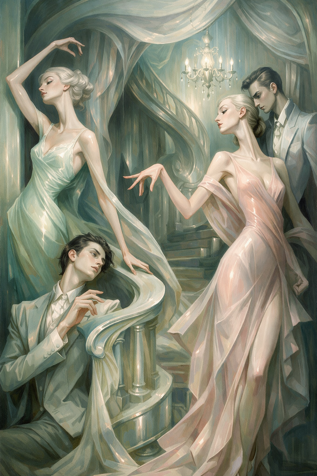 Art Prompt (Mannerism): A dramatic interior scene rendered with elongated, elegant figures posed in subtly unnatural postures, their gestures expressive and slightly tense. The composition feels vertically stretched, with swirling architectural elements that bend perspective just enough to feel unstable. Colors are cool and luminous — soft greens, pale blues, muted pinks — contrasted by sharp highlights that give the scene a polished, almost porcelain sheen. Faces are serene yet emotionally charged, with refined features and distant gazes. Lighting feels artificial and theatrical, casting gentle shadows that emphasize form over realism, creating a refined, uneasy beauty.